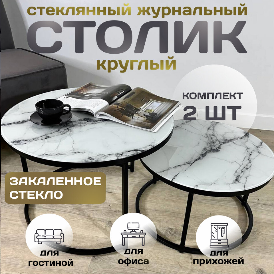 Купить Журнальный стол "Мартин" комплект круглый, 60х60х40 см Мрамор Белый с черными опорами