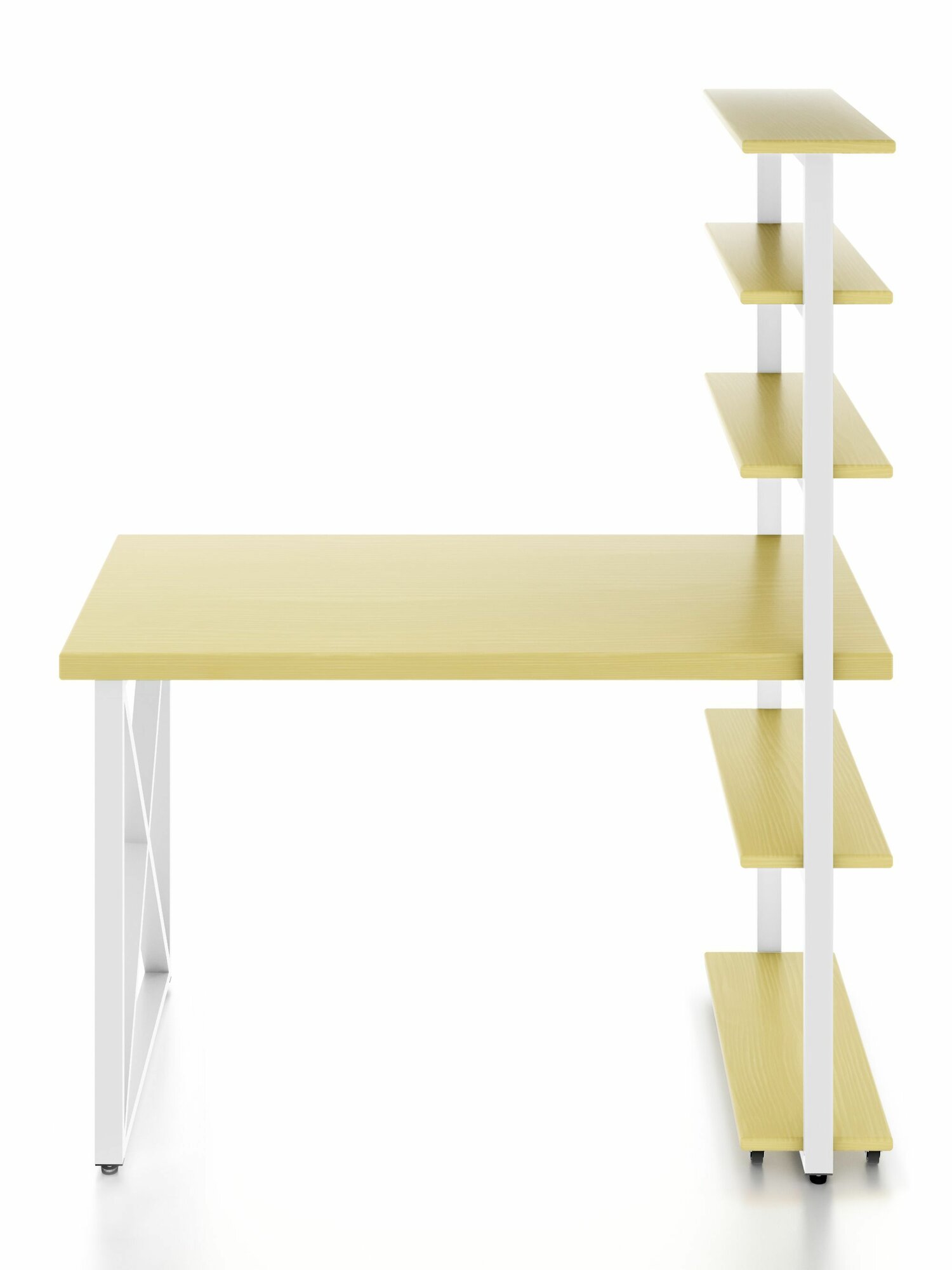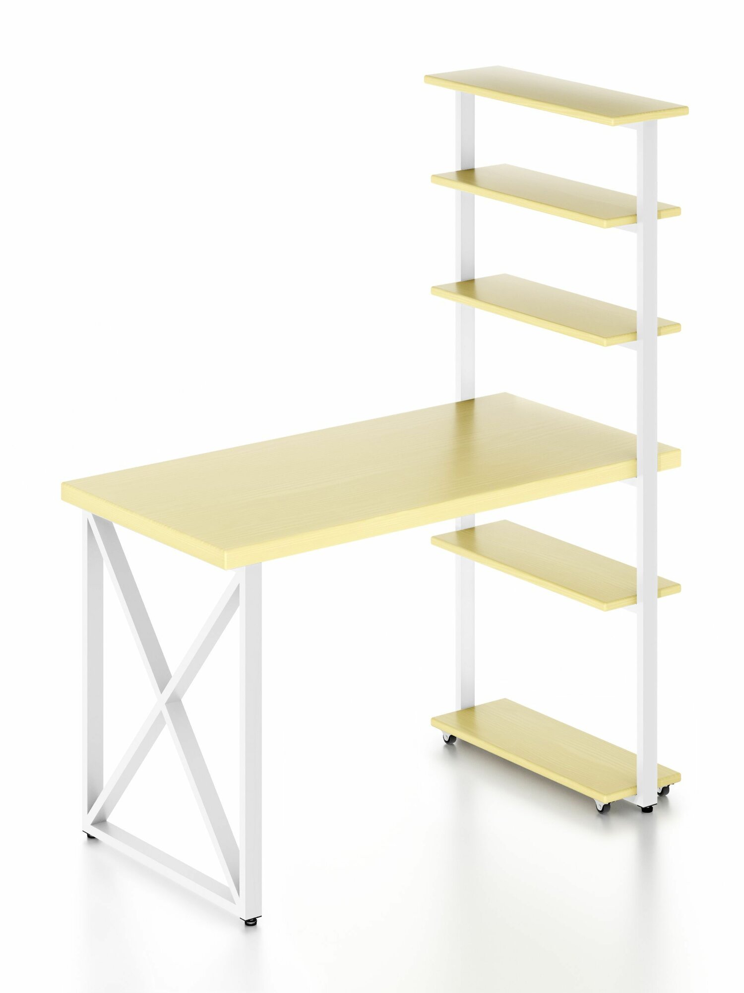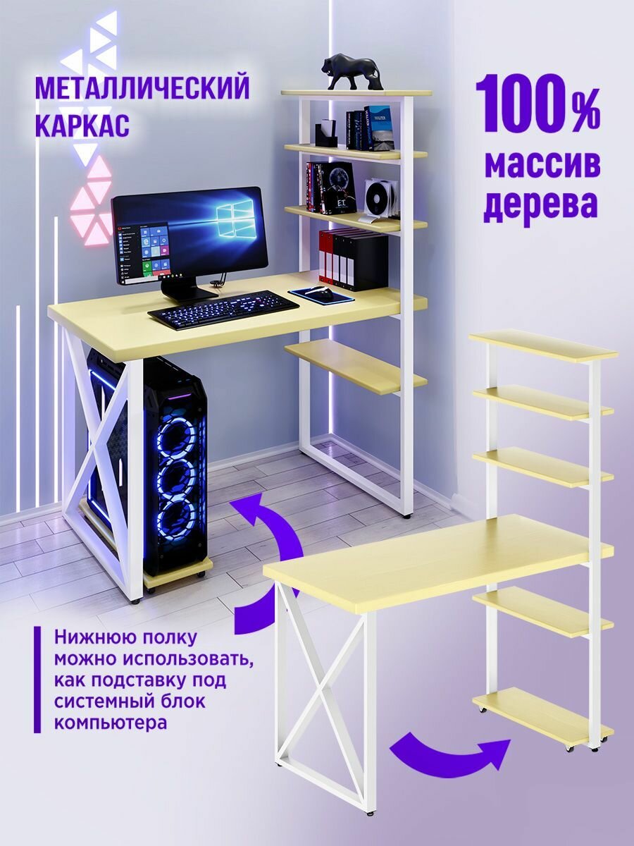 Стол компьютерный Loft с пятью полками, столешница цвета ванили из массива сосны 40 мм и белые металлические крестообразные ножки, 120х80х148 см