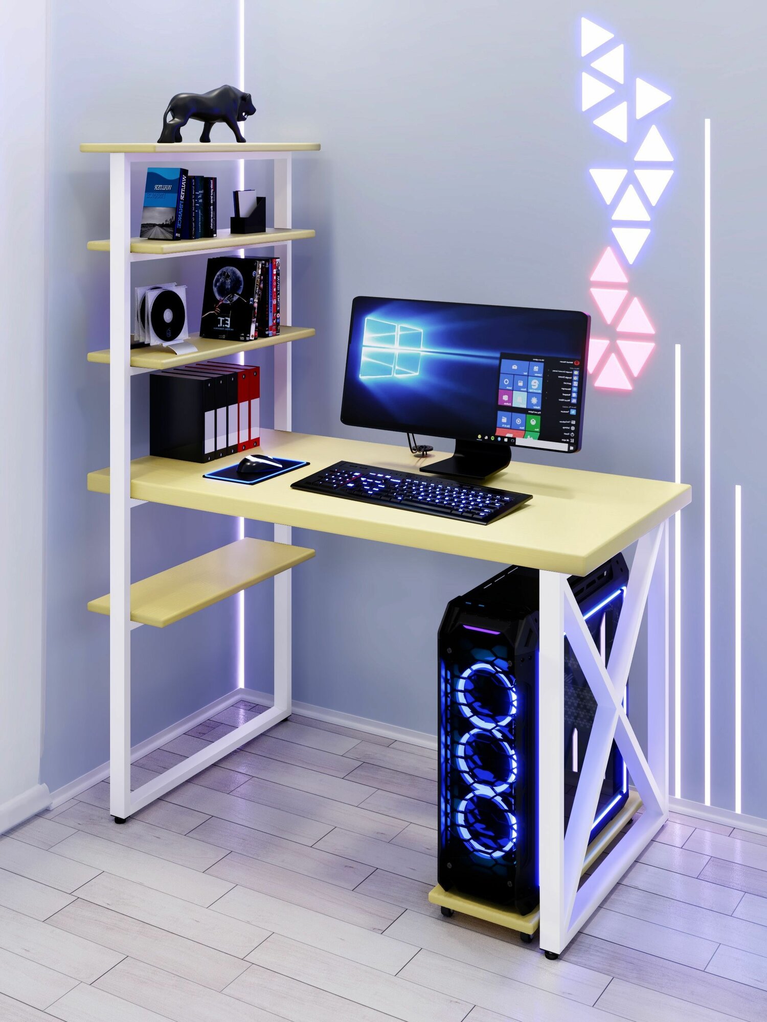 Стол компьютерный Loft с пятью полками, столешница цвета ванили из массива сосны 40 мм и белые металлические крестообразные ножки, 90х80х148 см