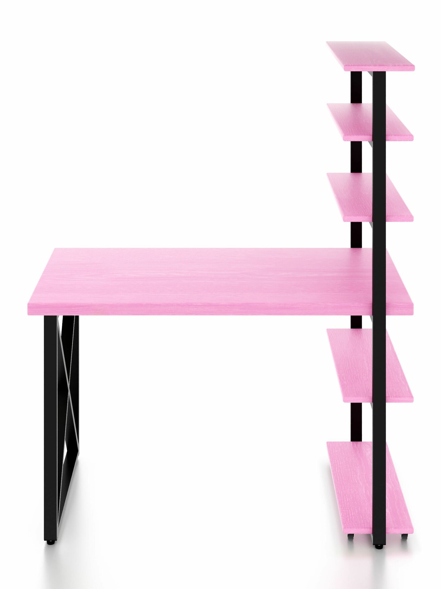 Стол компьютерный Loft с пятью полками, столешница розового цвета из массива сосны 40 мм и черные металлические крестообразные ножки, 100х80х148 см