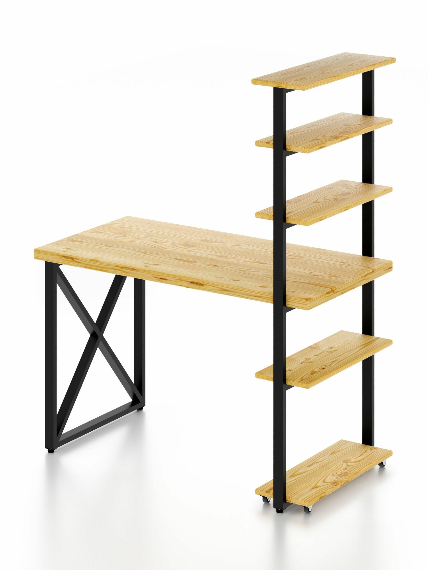 Стол компьютерный Loft с пятью полками, лакированная столешница из массива сосны 40 мм и черные металлические крестообразные ножки, 110х60х148 см