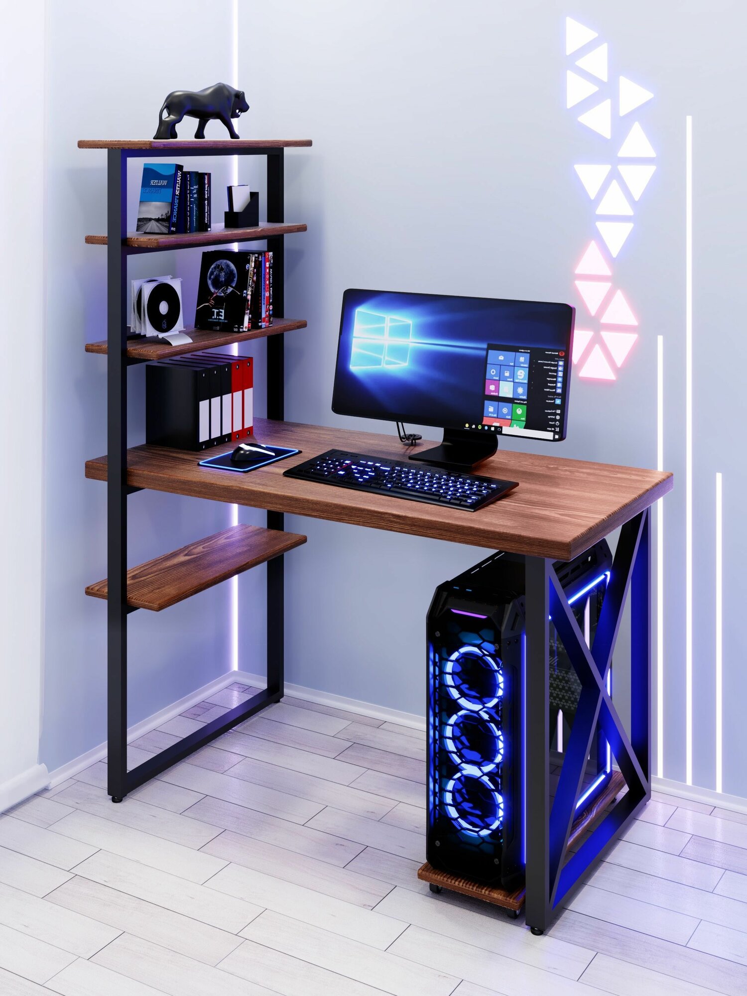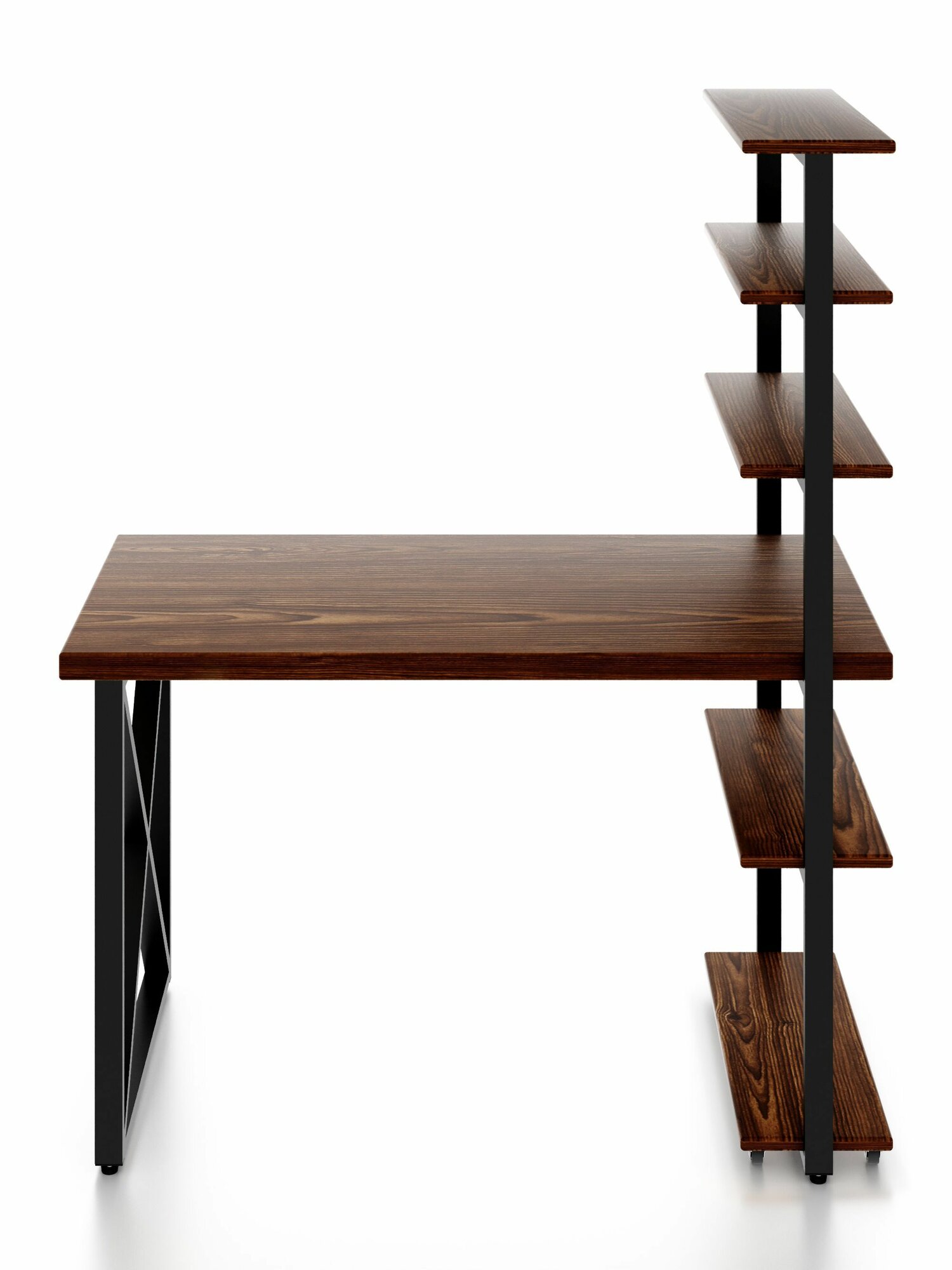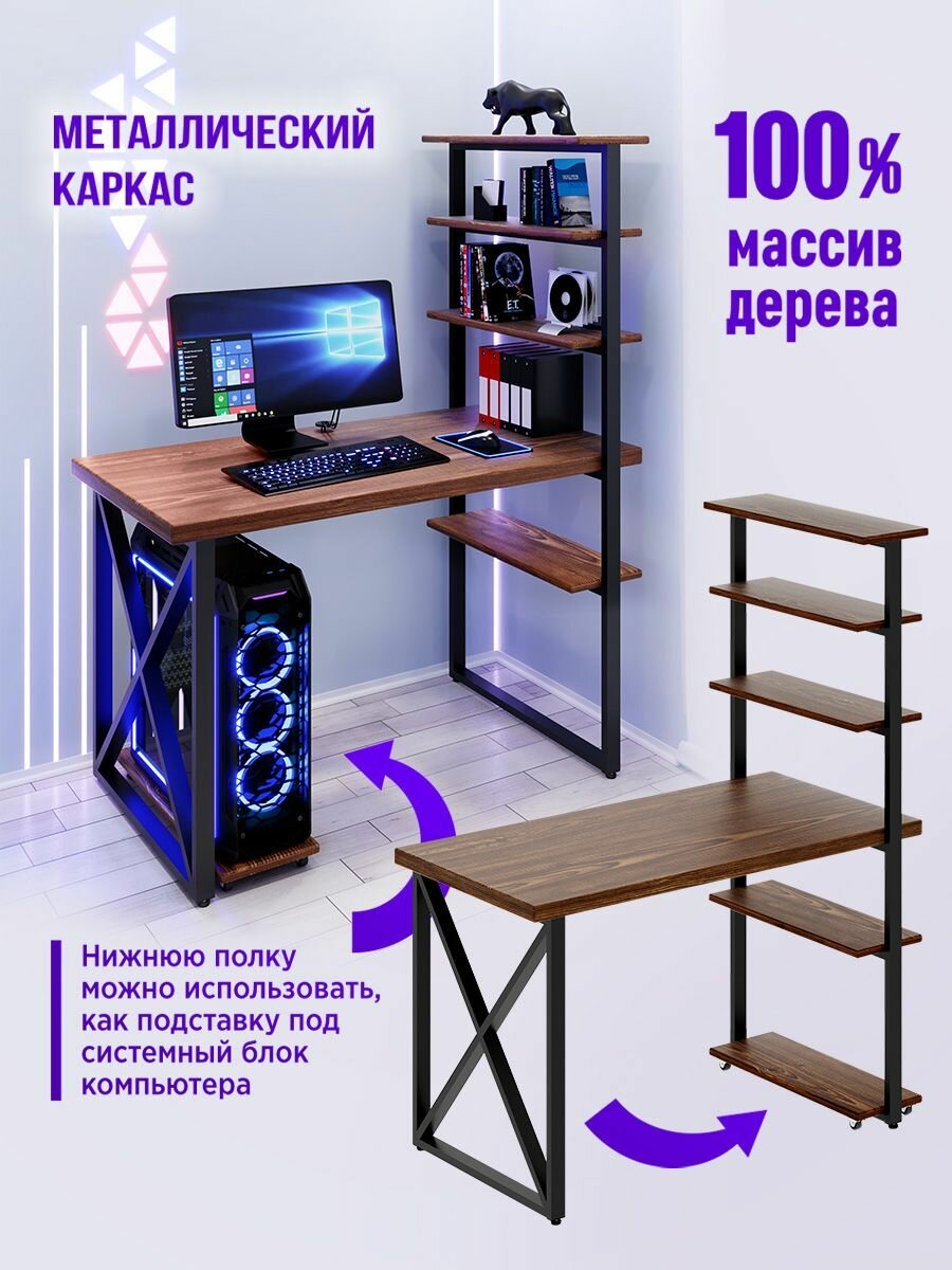 Купить Стол компьютерный Loft с пятью полками, столешница цвета темного дуба из массива сосны 40 мм и черные металлические крестообразные ножки, 100х60х148 см