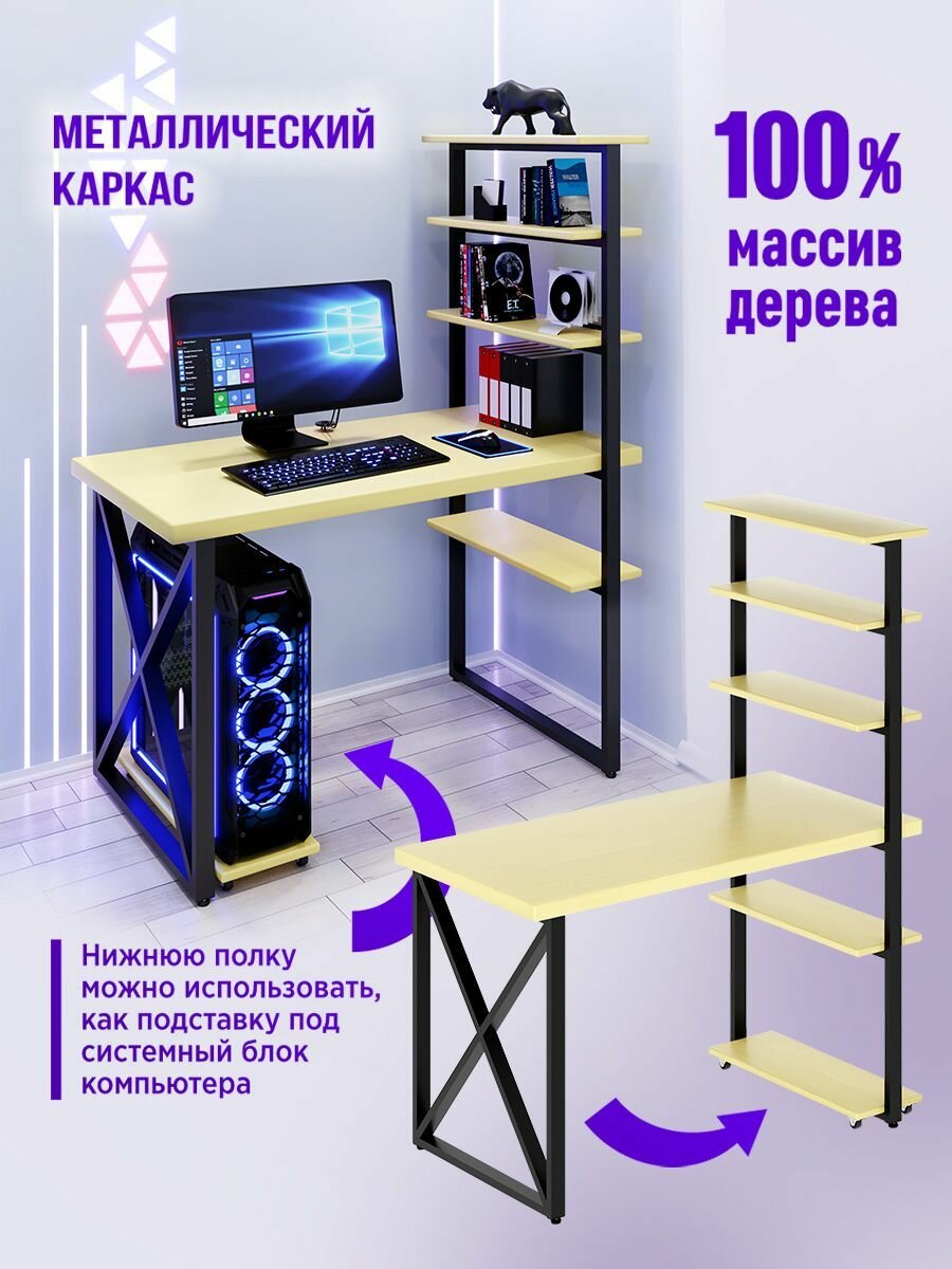 Стол компьютерный Loft с пятью полками, столешница цвета ванили из массива сосны 40 мм и черные металлические крестообразные ножки, 100х80х148 см