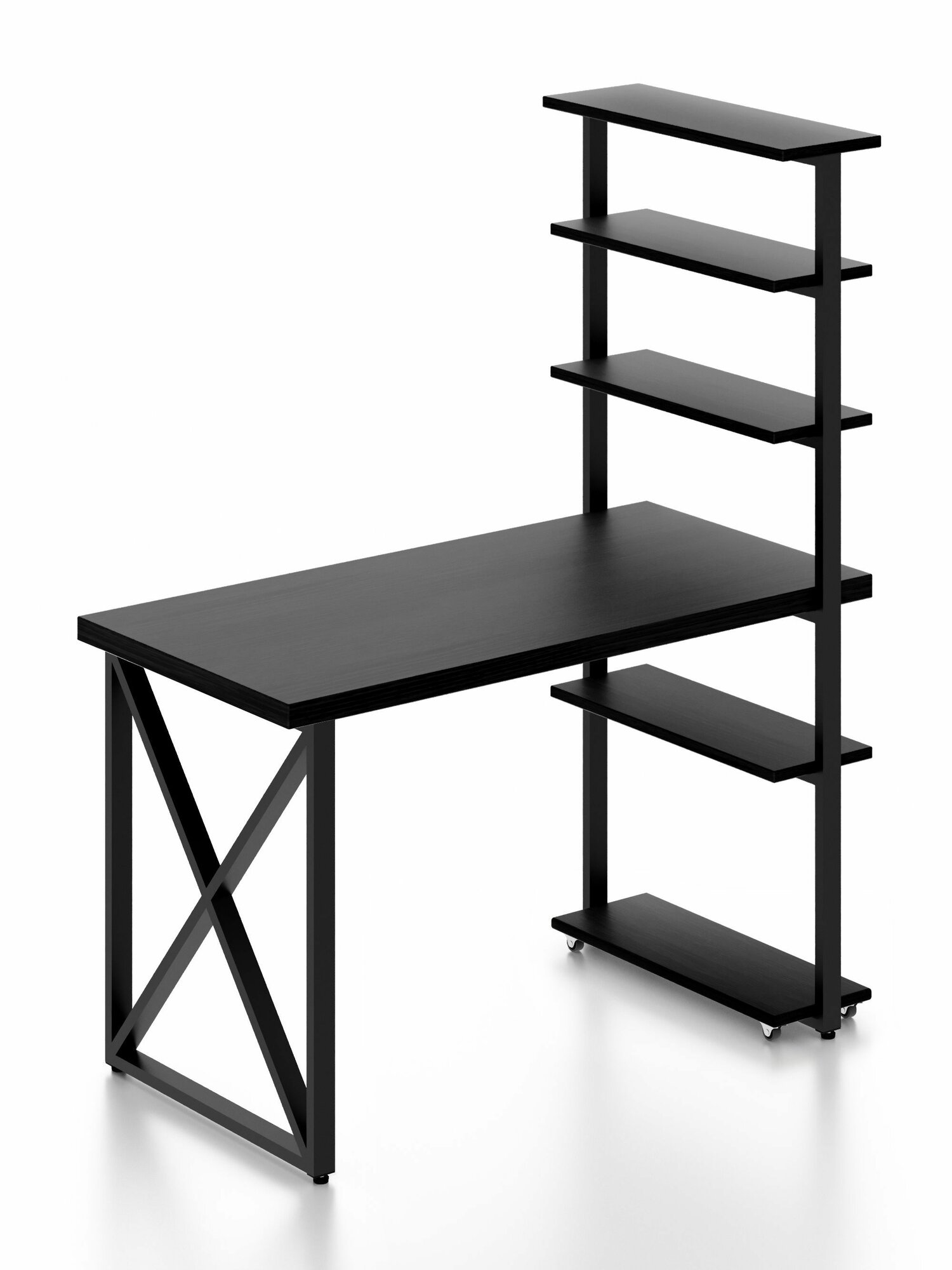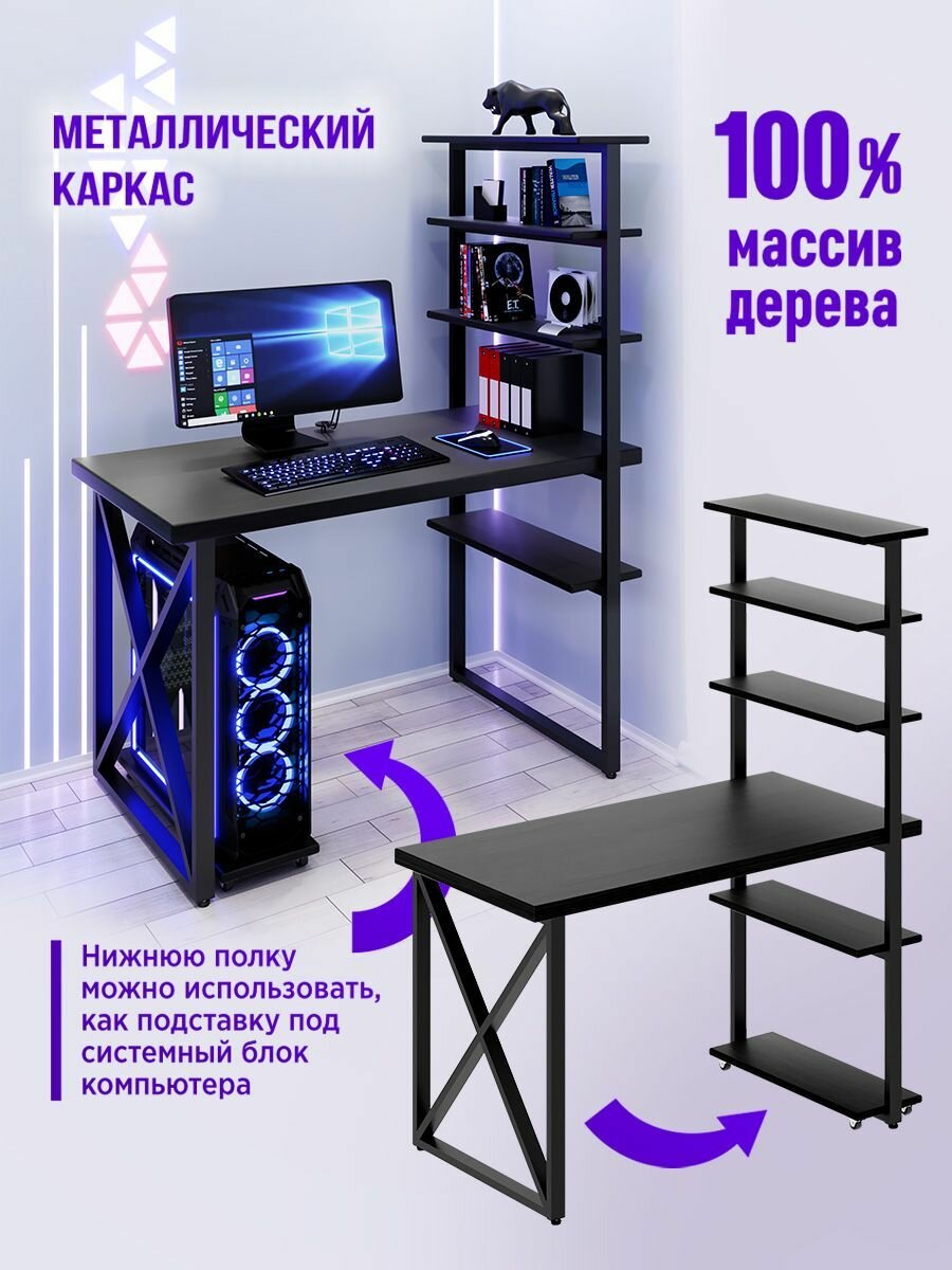Стол компьютерный Loft с пятью полками, столешница цвета черного оникса из массива сосны 40 мм и черные металлические крестообразные ножки, 100х80х148 см