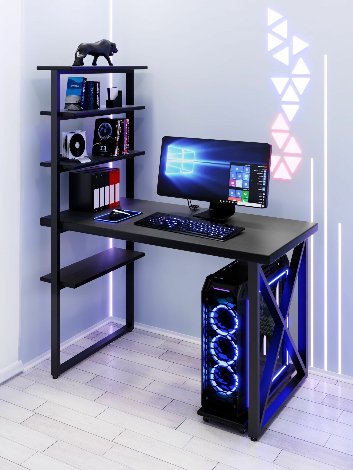 Стол компьютерный Loft с пятью полками, столешница голубого цвета из массива сосны 40 мм и черные металлические крестообразные ножки, 90х60х148 см