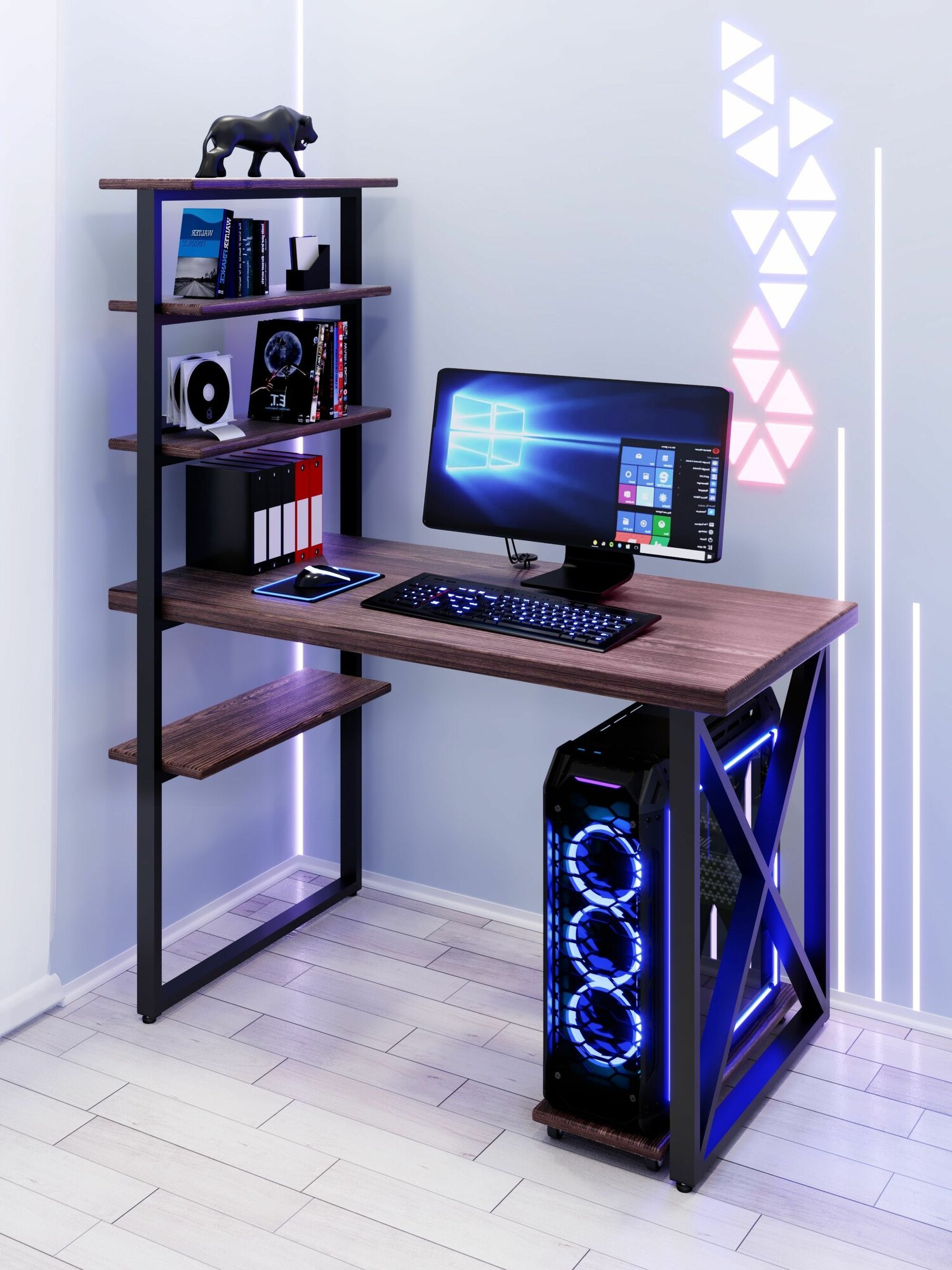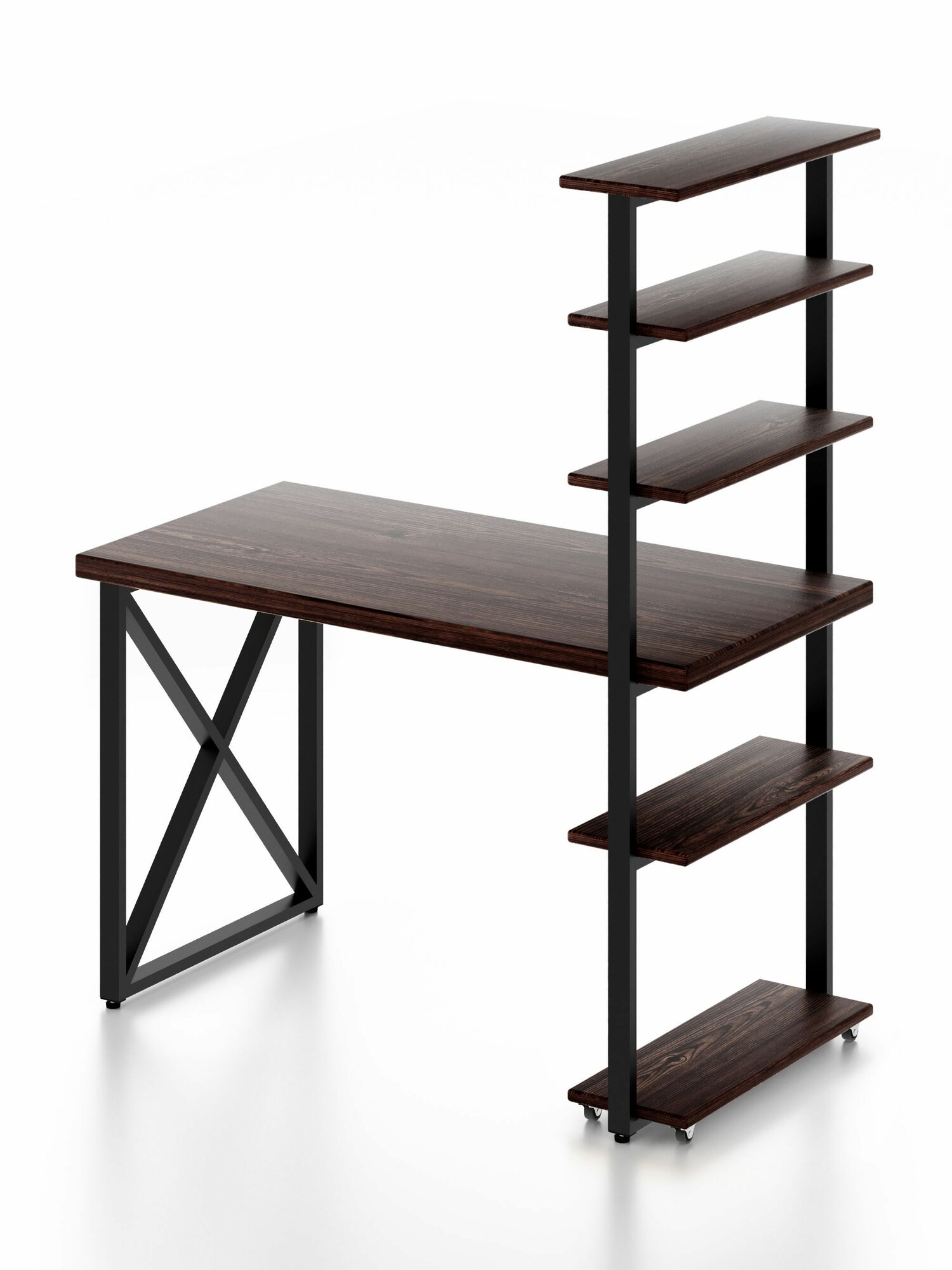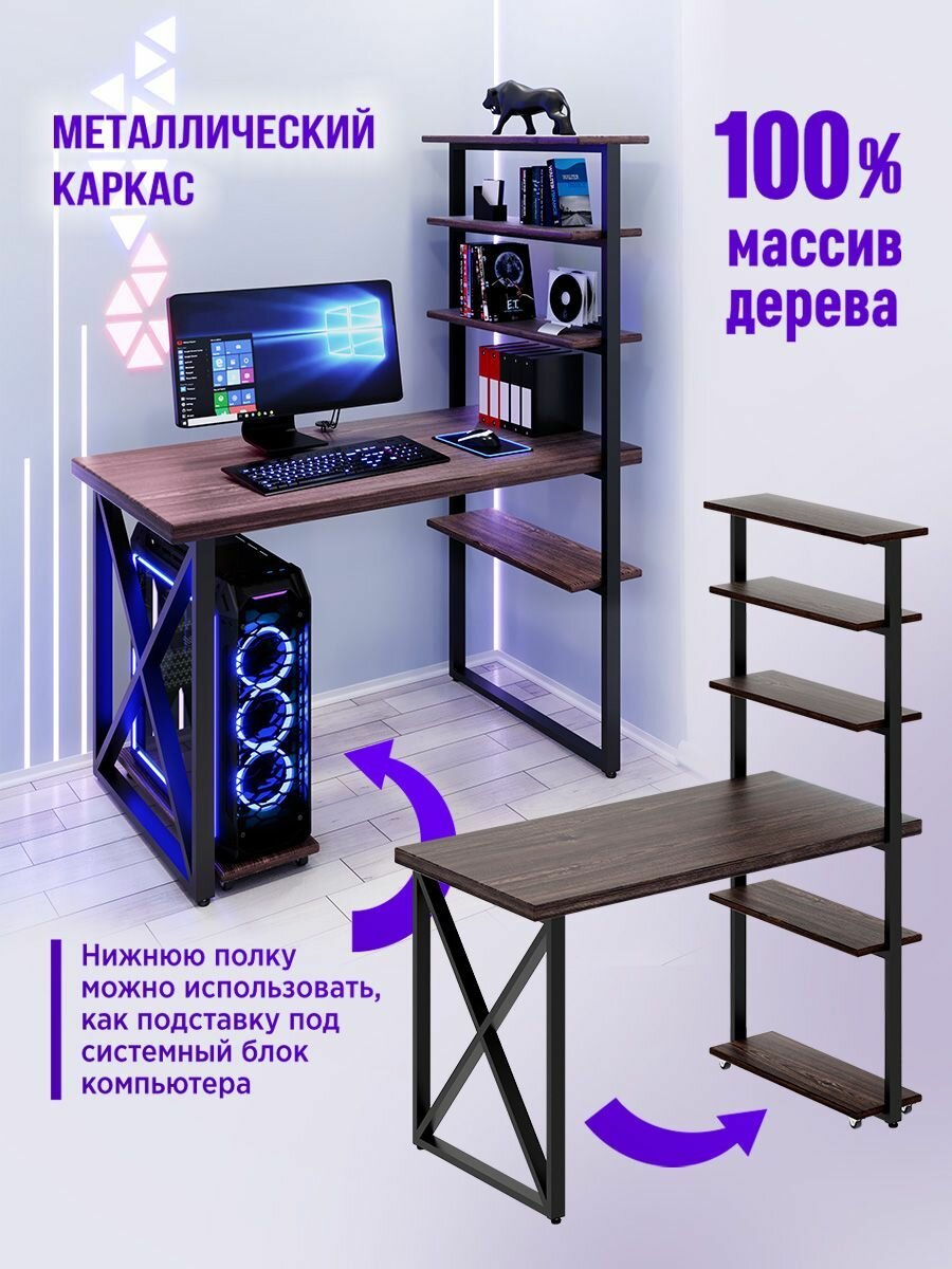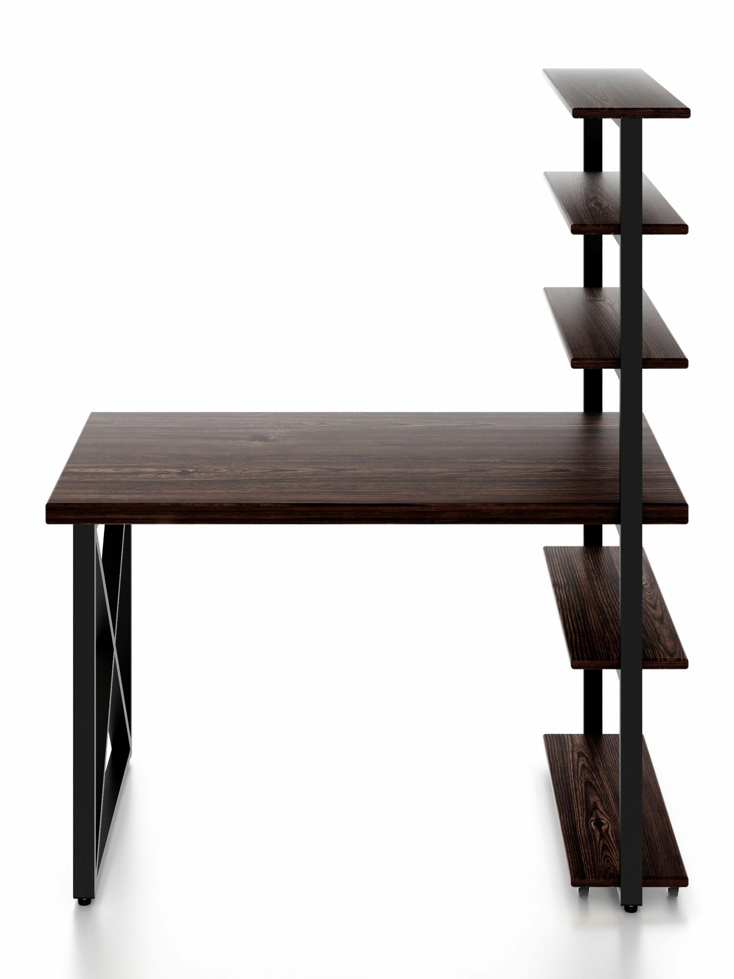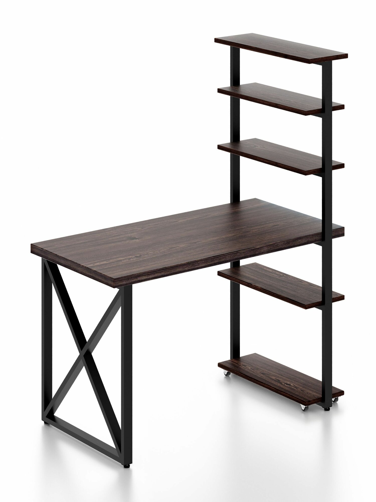 Стол компьютерный Loft с пятью полками, столешница цвета темного дуба из массива сосны 40 мм и черные металлические крестообразные ножки, 100х60х148 см