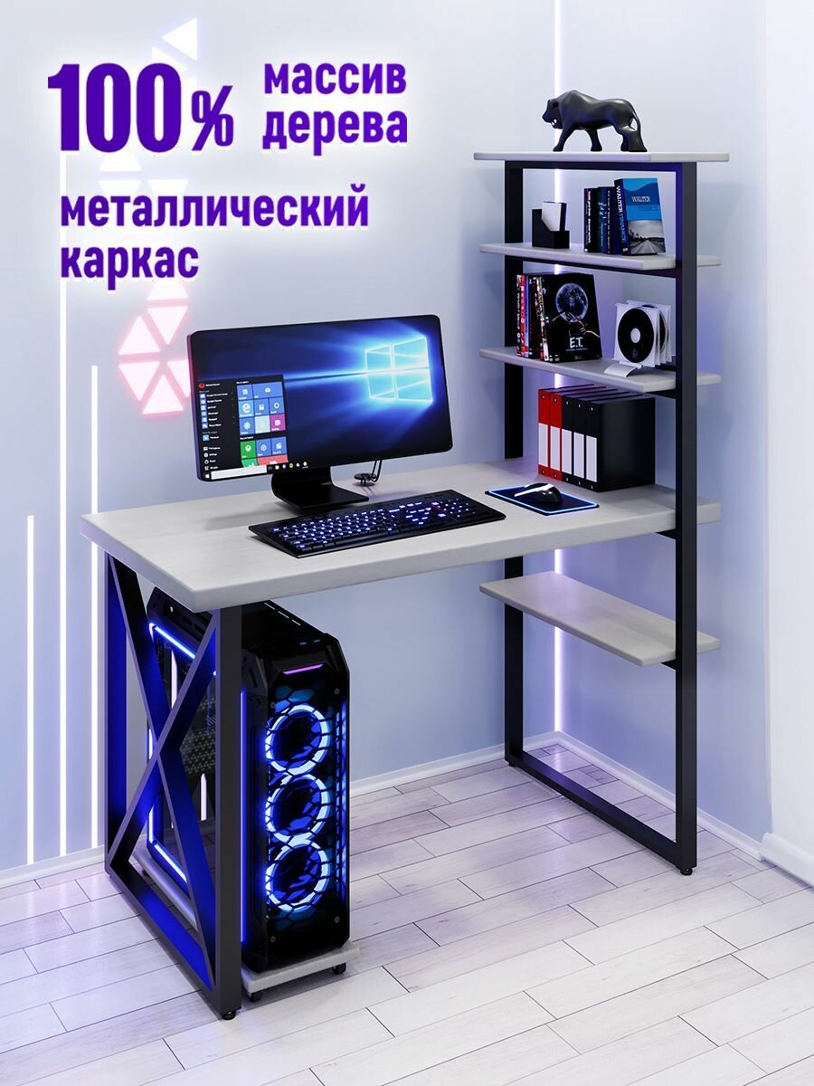 Стол компьютерный Loft с пятью полками, столешница цвета платины из массива сосны 40 мм и черные металлические крестообразные ножки, 100х80х148 см