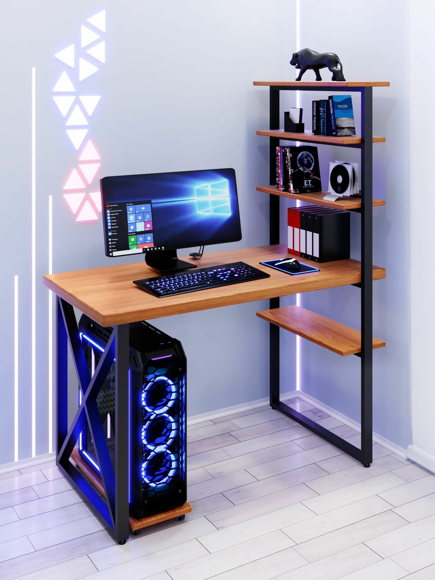 Стол компьютерный Loft с пятью полками, столешница цвета ольхи из массива сосны 40 мм и черные металлические крестообразные ножки, 100х80х148 см