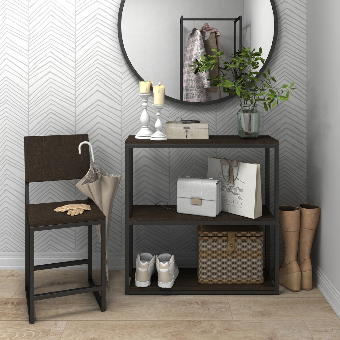 Прихожая Basko К6, комплект мебели в прихожую, Графит/дуб крафт золотой, 140х235х34,9 см (ШхВхГ)
