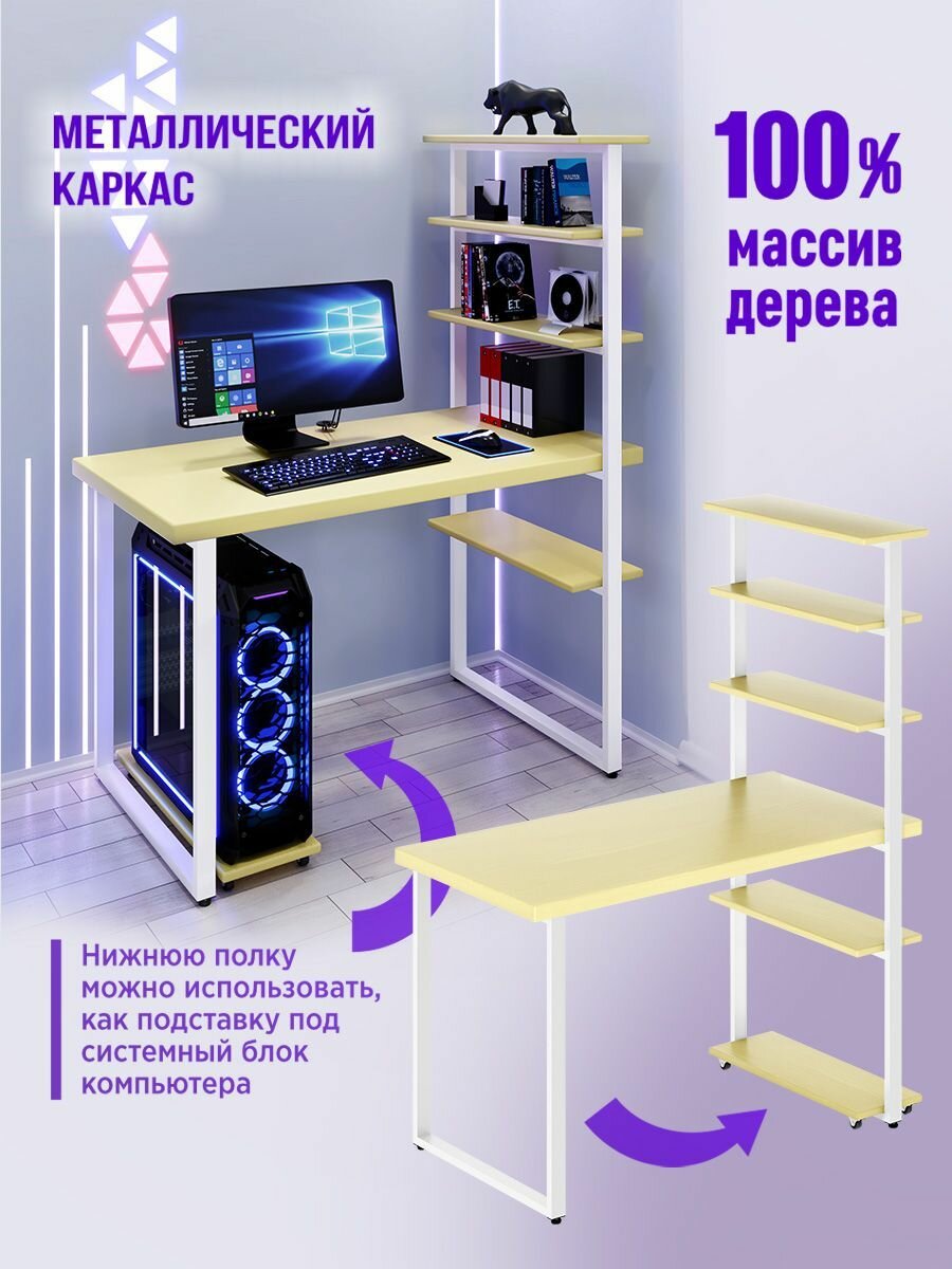 Стол компьютерный Loft с пятью полками, столешница цвета ванили из массива сосны 40 мм и белые металлические ножки, 100х80х148 см