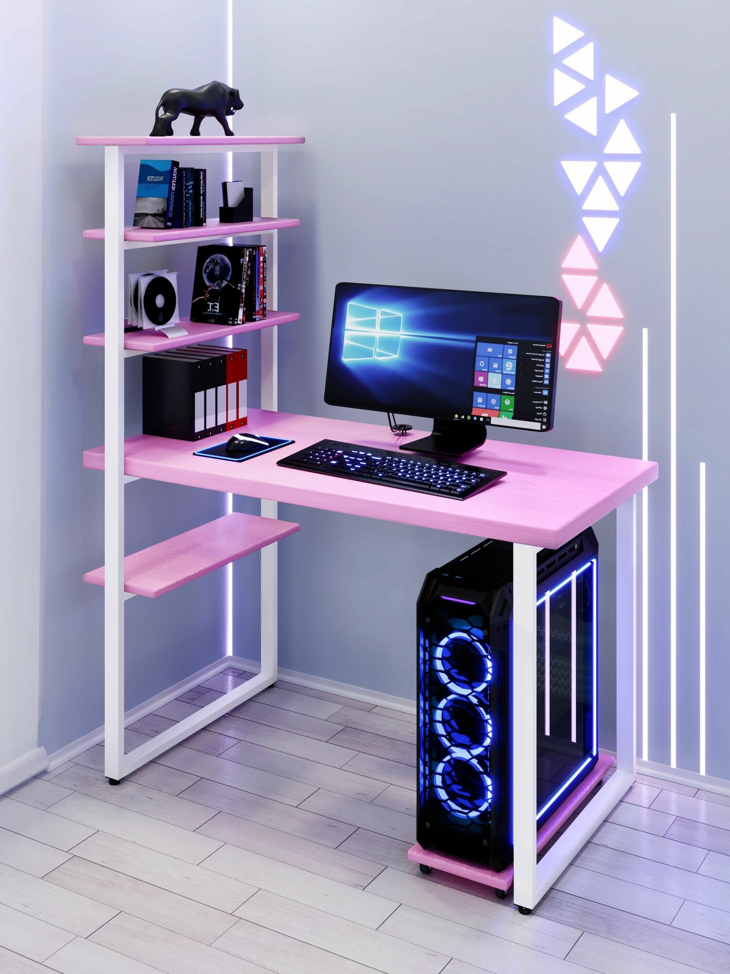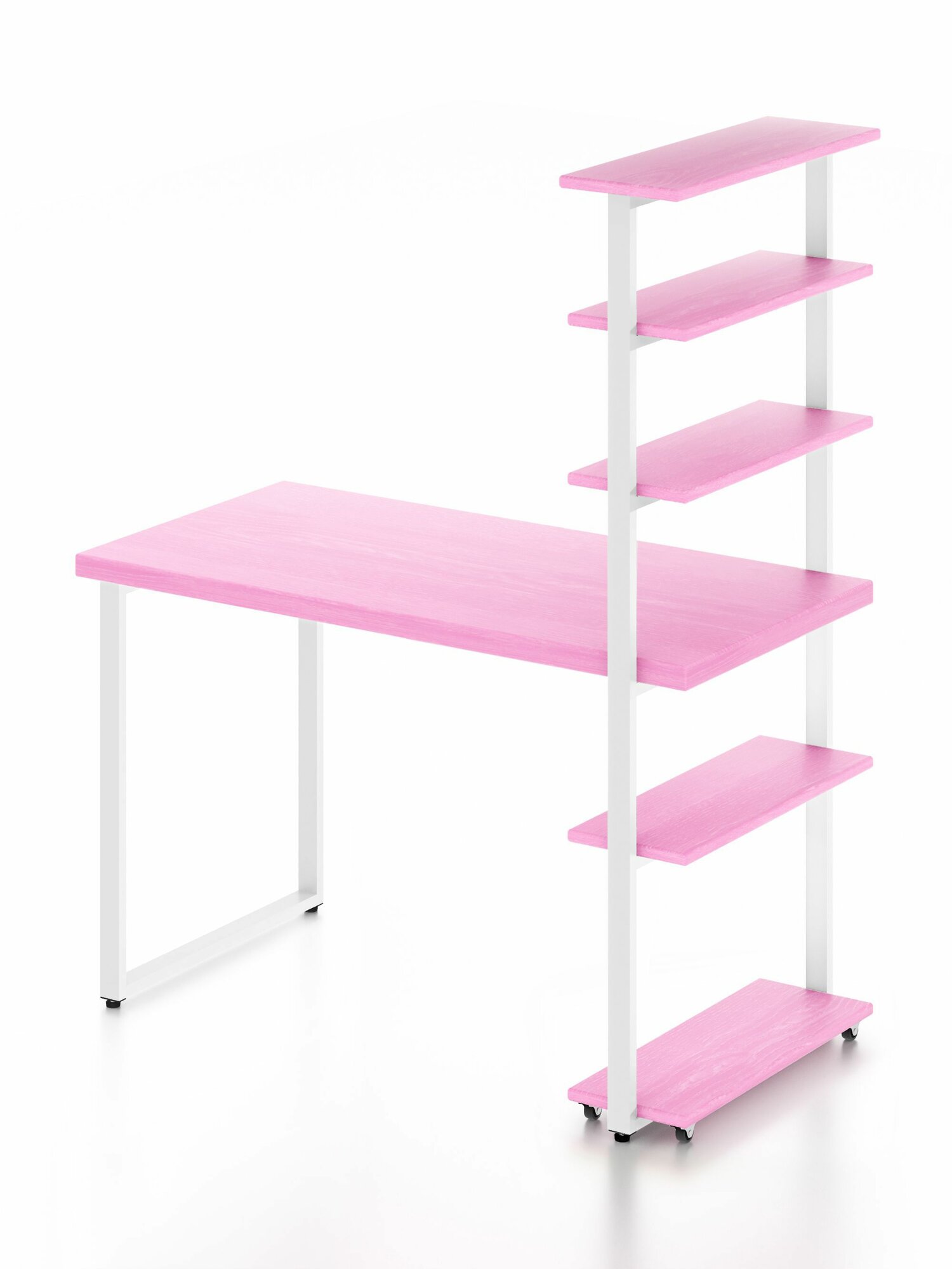 Стол компьютерный Loft с пятью полками, столешница розового цвета из массива сосны 40 мм и белые металлические ножки, 100х60х148 см