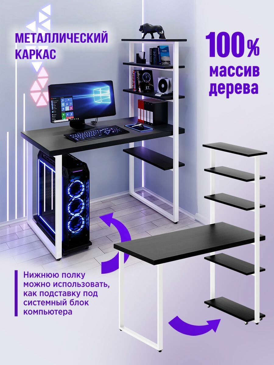 Стол компьютерный Loft с пятью полками, столешница цвета черного оникса из массива сосны 40 мм и белые металлические ножки, 120х80х148 см