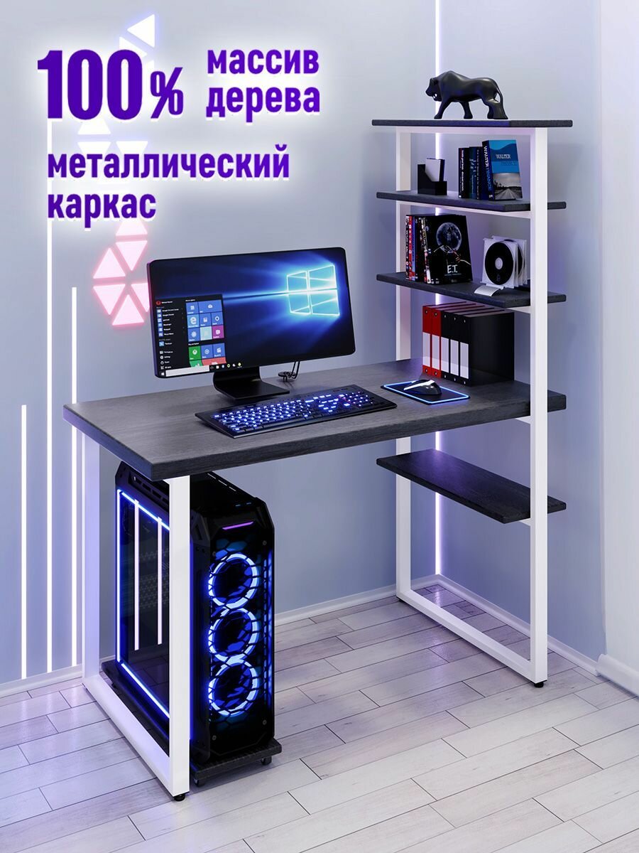 Стол компьютерный Loft с пятью полками, столешница цвета черного оникса из массива сосны 40 мм и белые металлические ножки, 110х80х148 см