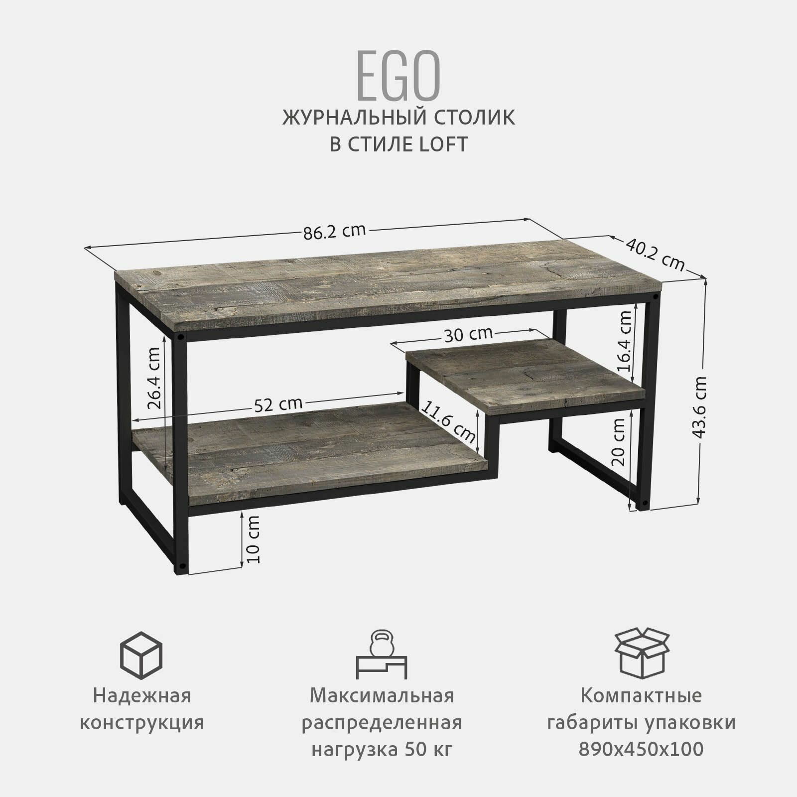 СохранитьЖурнальный столик EGO, серый, приставной стол стеллаж с полками в стиле лофт, 86,2х40,2х43,6 см, гростат интересное: