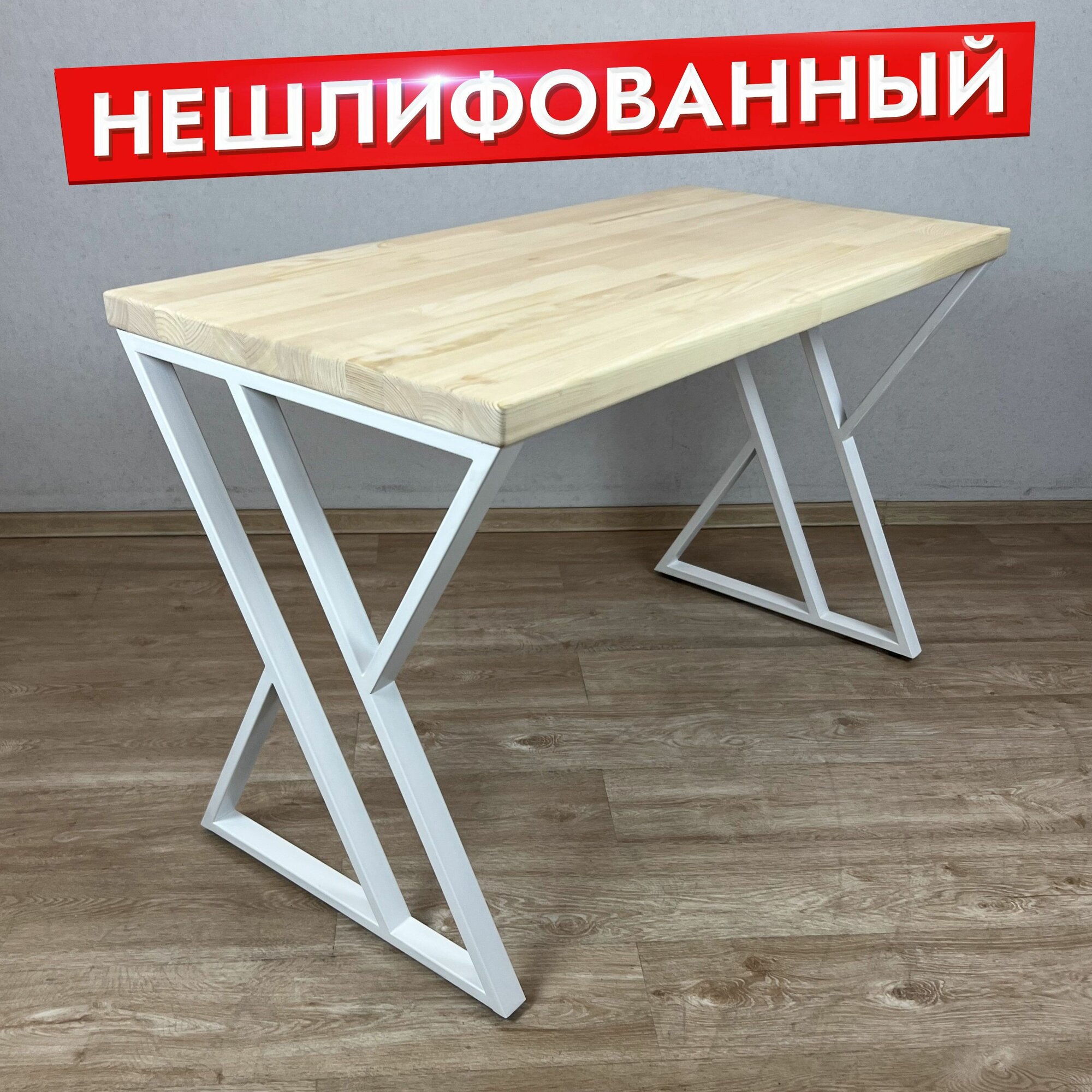 Купить Стол кухонный Loft со столешницей без шлифовки и покрытия из массива сосны 40 мм и белыми металлическими Z-образными ножками, 110х80х75 см
