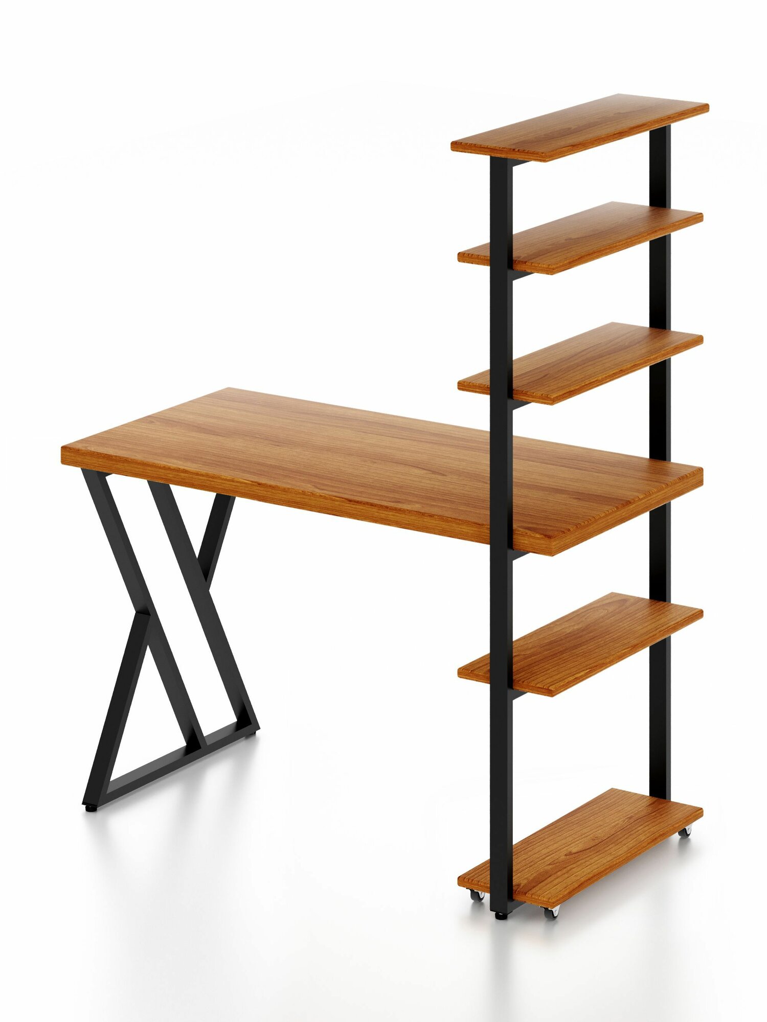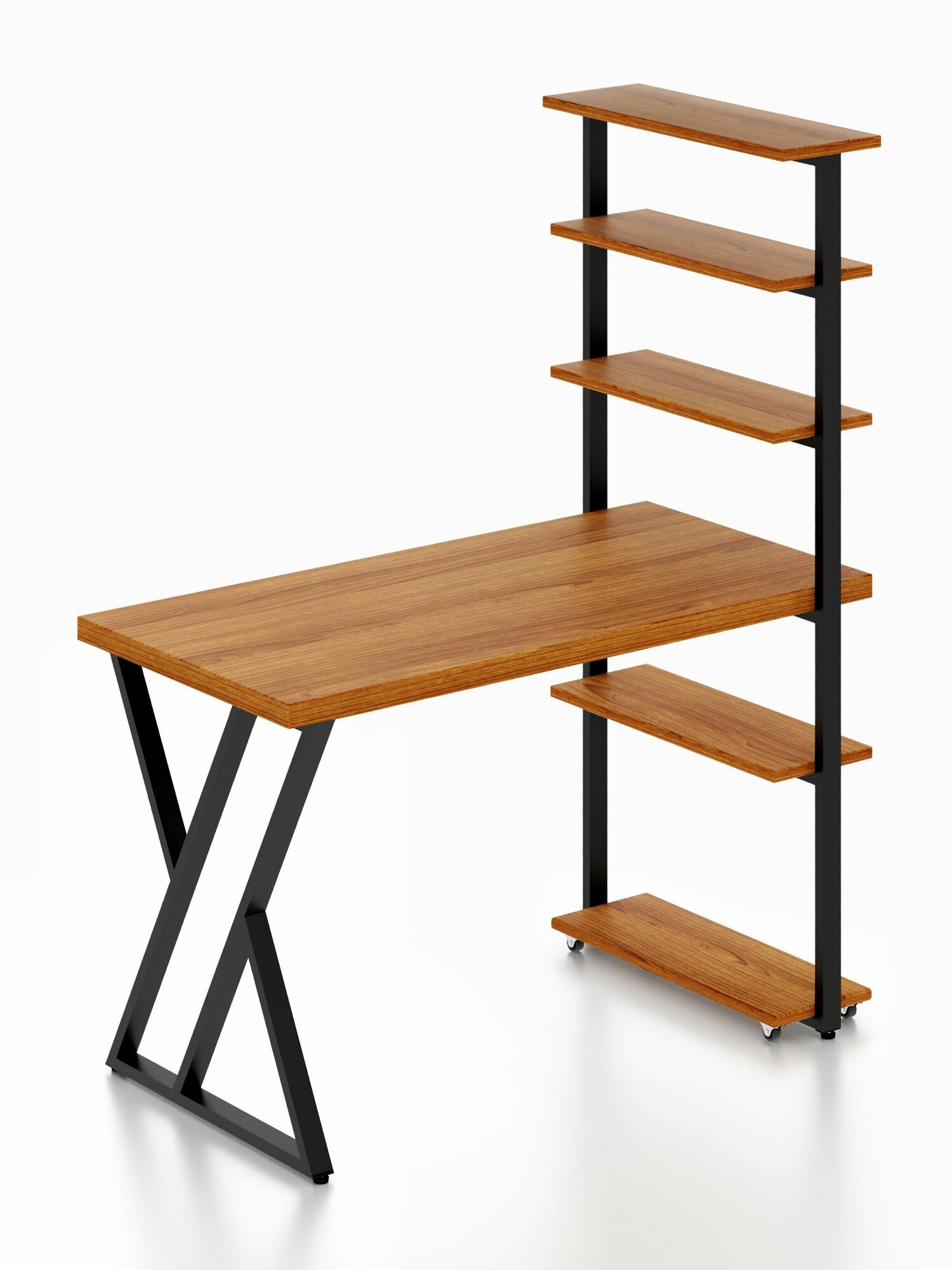 Стол компьютерный Loft с пятью полками, столешница цвета ольхи из массива сосны 40 мм и черные металлические Z-образные ножки, 100х80х148 см