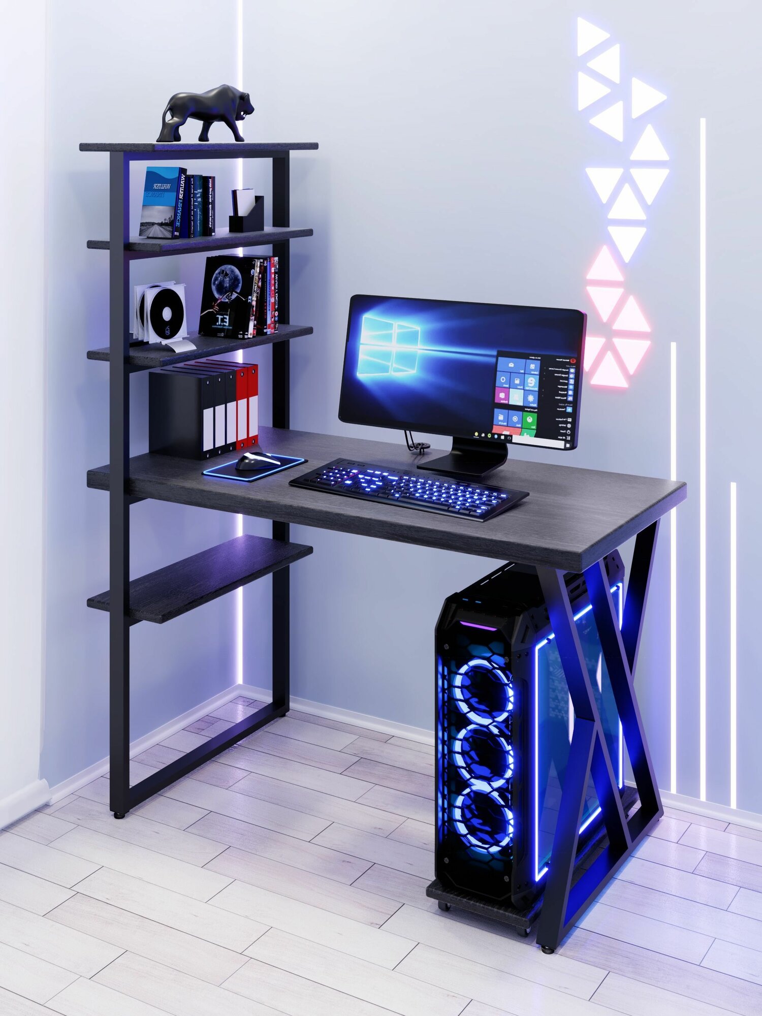 Стол компьютерный Loft с пятью полками, столешница цвета темного дуба из массива сосны 40 мм и черные металлические Z-образные ножки, 110х60х148 см