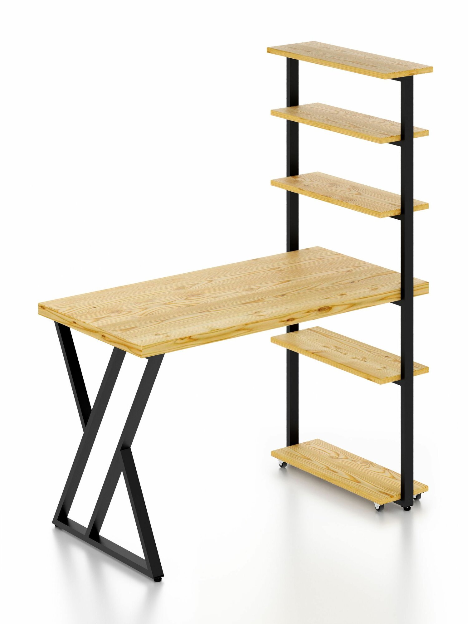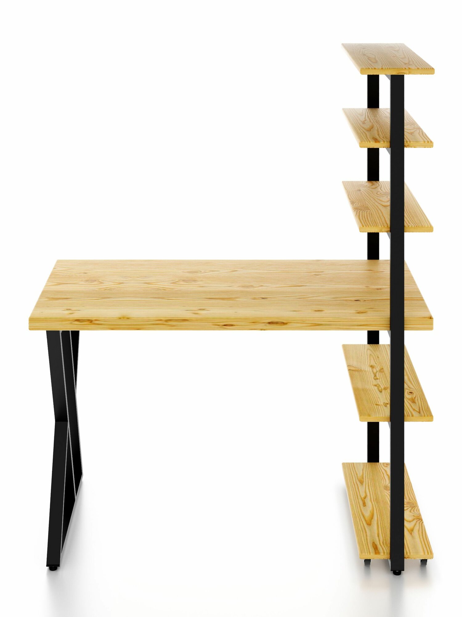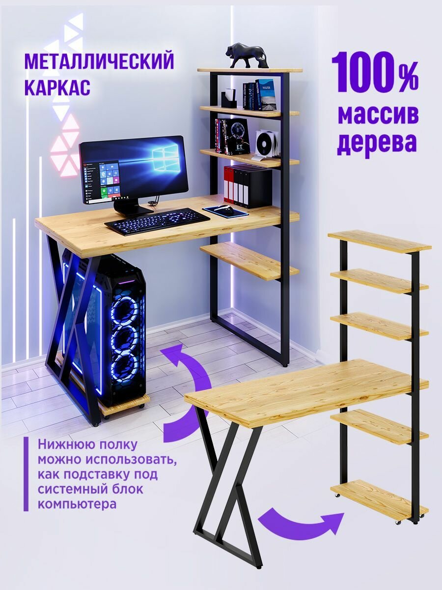 Стол компьютерный Loft с пятью полками, лакированная столешница из массива сосны 40 мм и черные металлические Z-образные ножки, 100х60х148 см