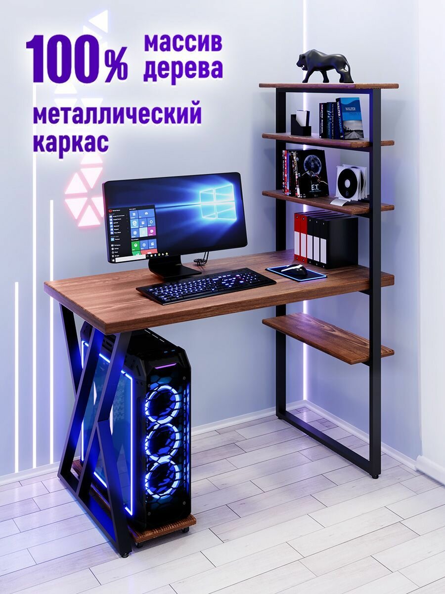 Стол компьютерный Loft с пятью полками, столешница цвета темного дуба из массива сосны 40 мм и черные металлические Z-образные ножки, 120х60х148 см