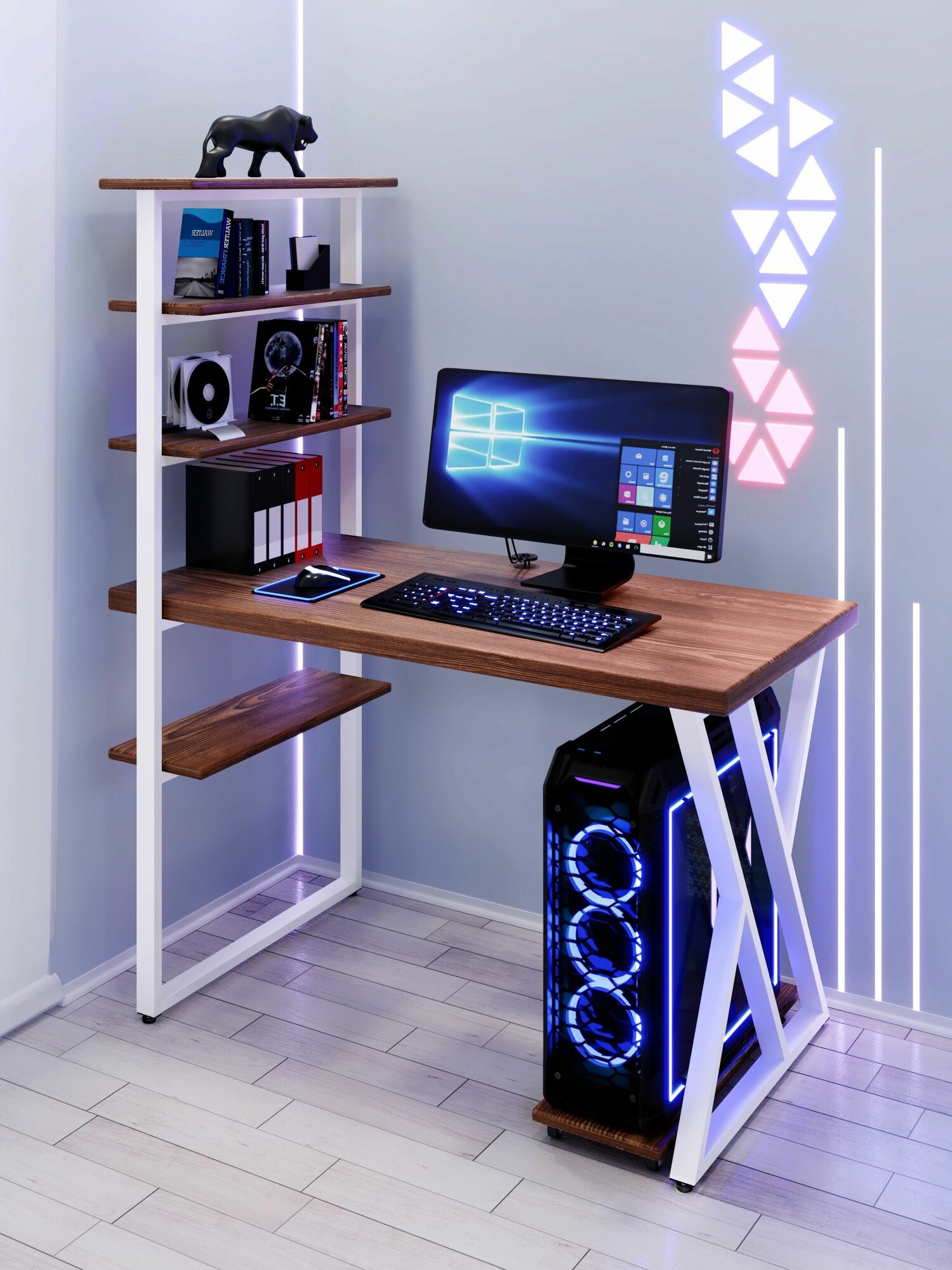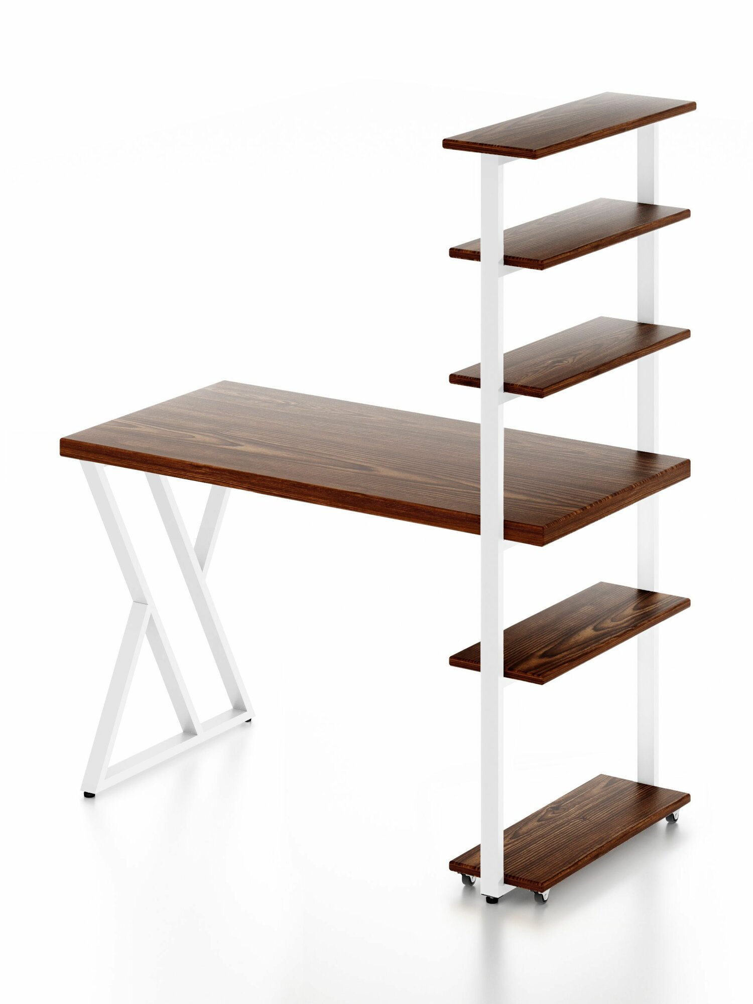 Стол компьютерный Loft с пятью полками, столешница цвета темного дуба из массива сосны 40 мм и белые металлические Z-образные ножки, 110х60х148 см