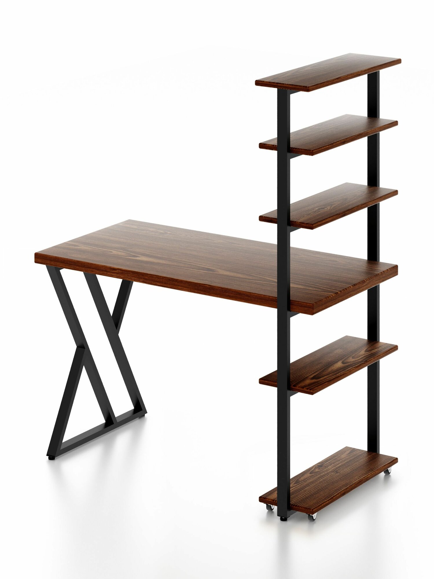 Стол компьютерный Loft с пятью полками, столешница цвета темного дуба из массива сосны 40 мм и черные металлические Z-образные ножки, 100х80х148 см