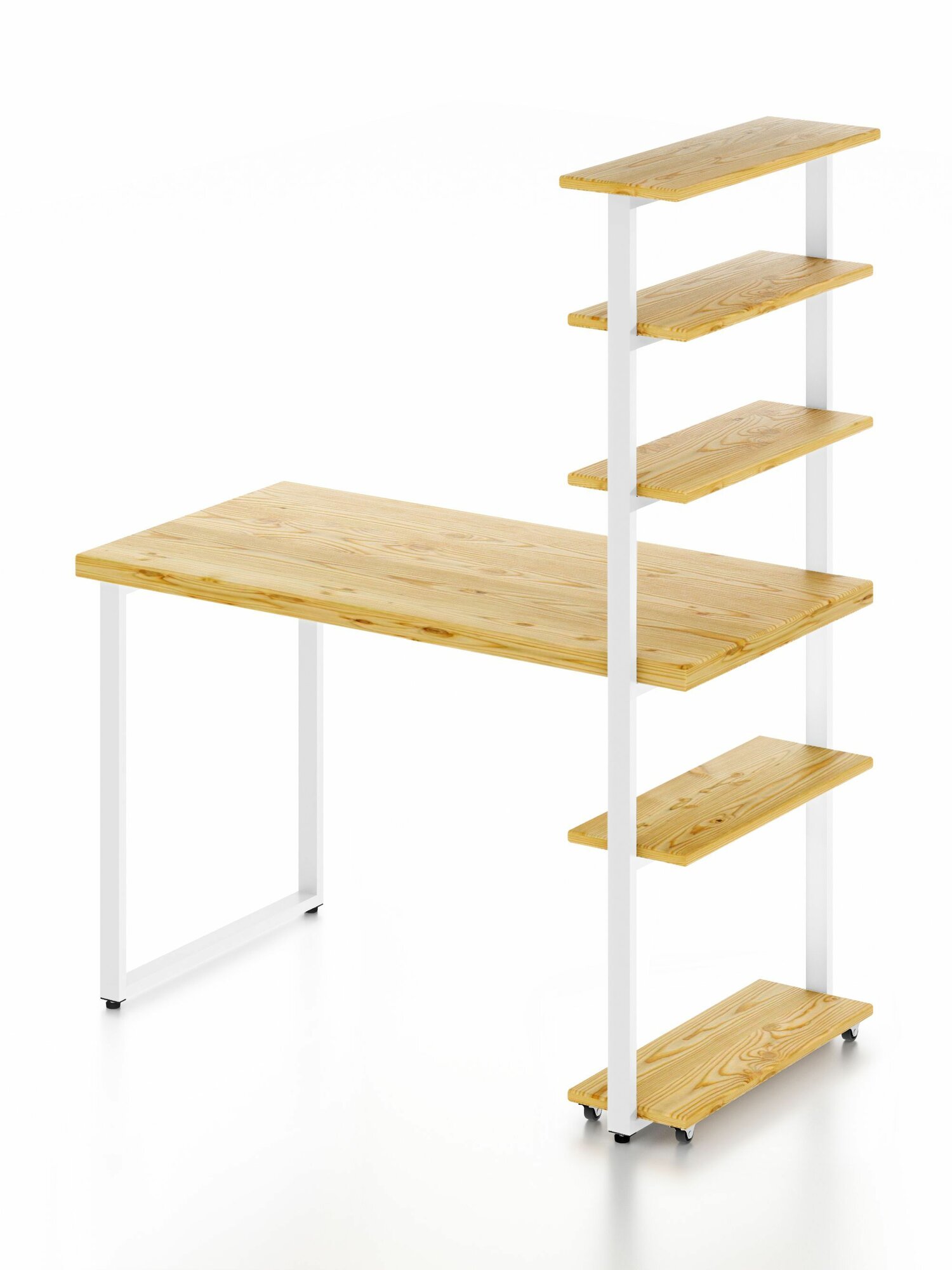Стол компьютерный Loft с пятью полками, лакированная столешница из массива сосны 40 мм и белые металлические ножки, 100х60х148 см