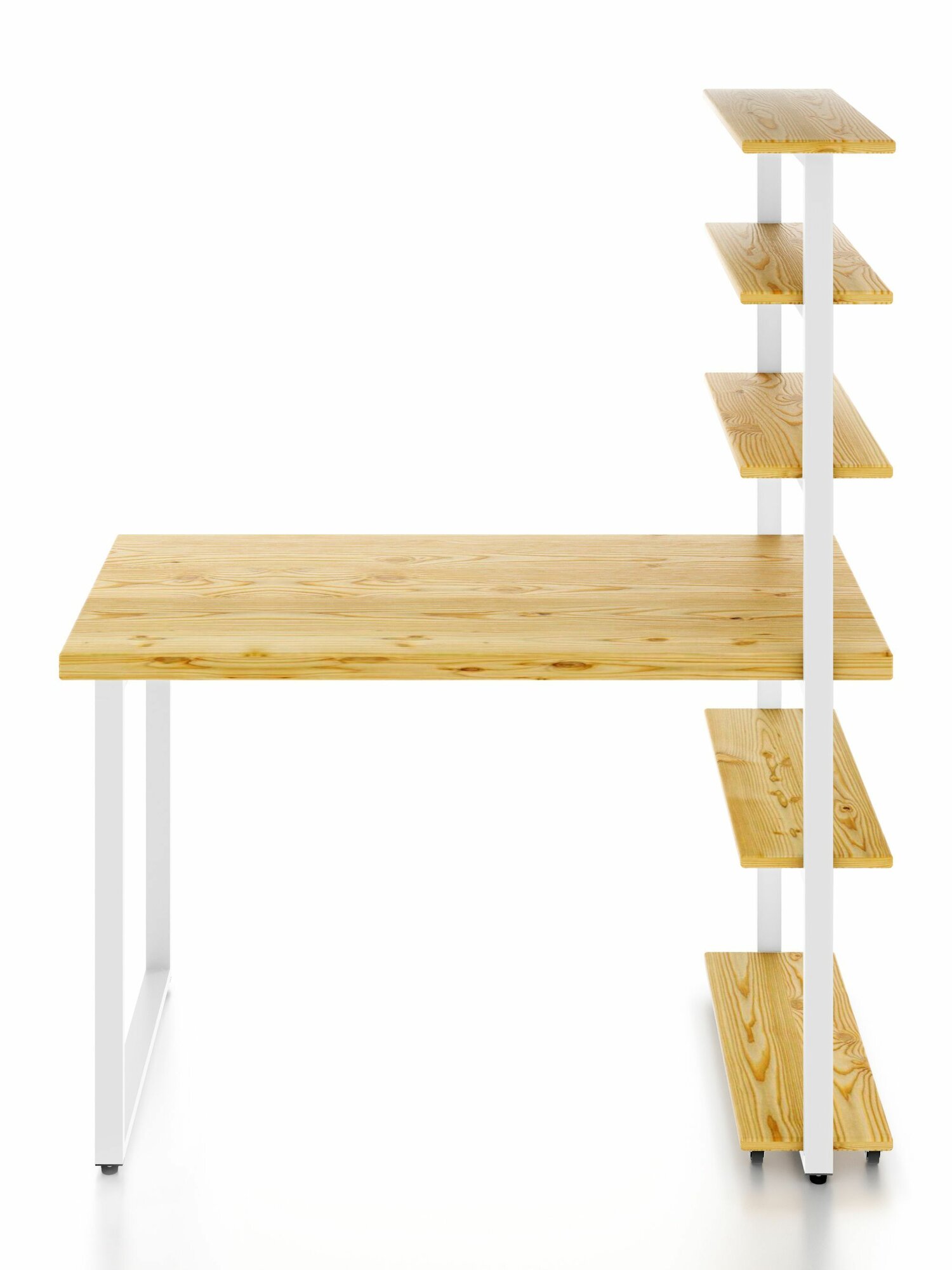 Стол компьютерный Loft с пятью полками, лакированная столешница из массива сосны 40 мм и белые металлические ножки, 100х80х148 см