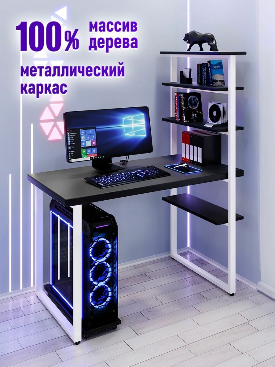 Стол компьютерный Loft с пятью полками, столешница цвета черного оникса из массива сосны 40 мм и белые металлические ножки, 100х60х148 см