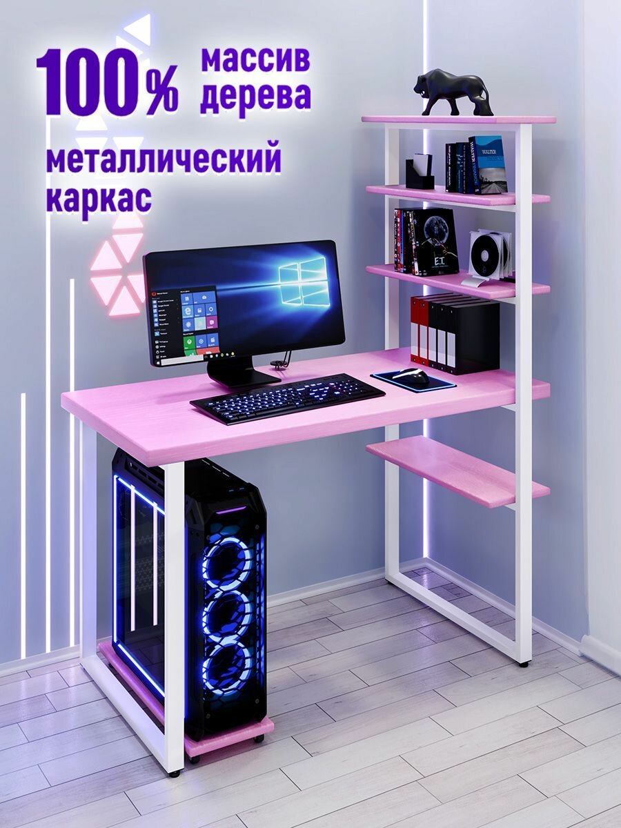 Стол компьютерный Loft с пятью полками, столешница розового цвета из массива сосны 40 мм и белые металлические ножки, 110х80х148 см