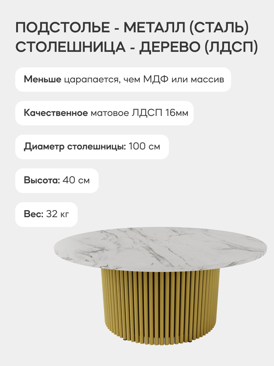 СохранитьGEN GROUP Стол журнальный круглый TRUBIS Wood M D100 белый мрамор с золотым металлическим подстольем интересное: