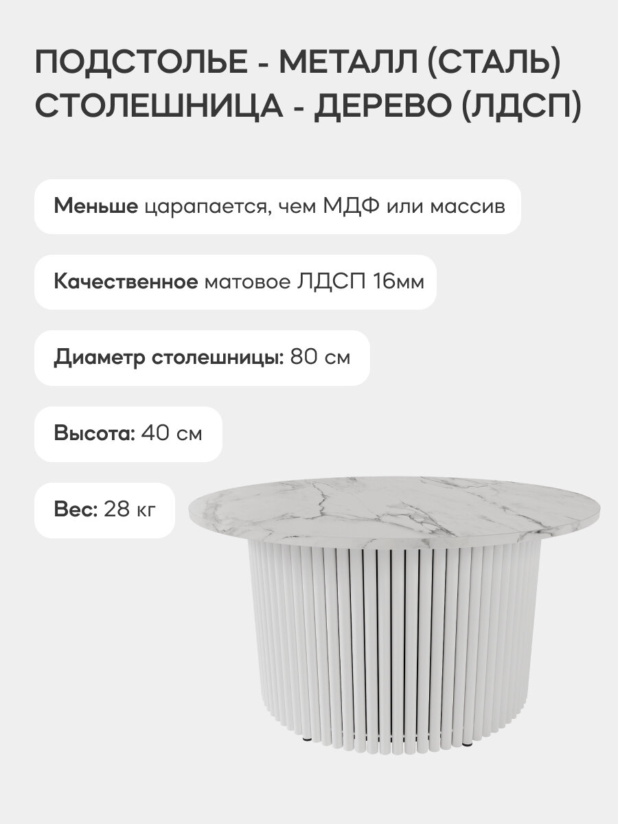 GEN GROUP Стол круглый журнальный TRUBIS Wood D120 см, белый мрамор с белым металлическим подстольем