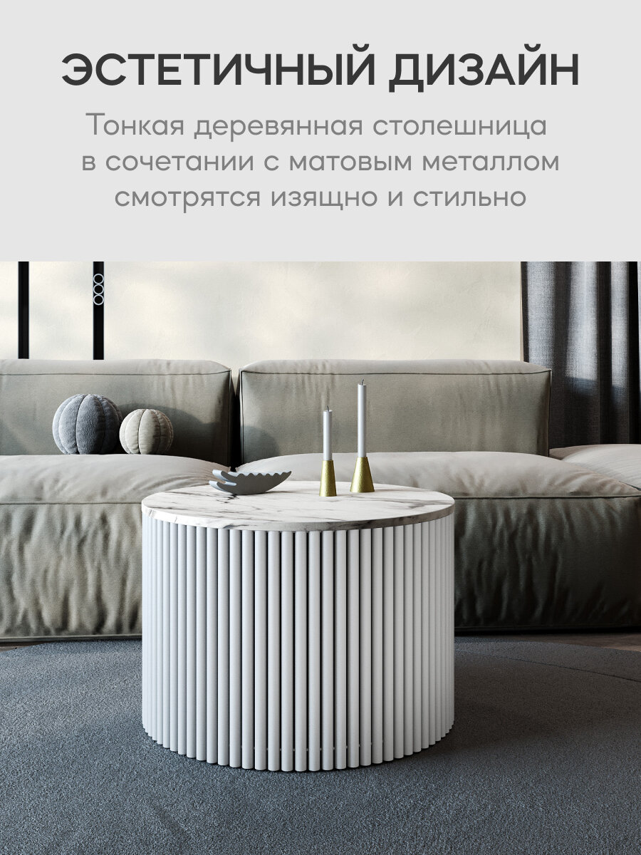 GEN GROUP Стол круглый журнальный TRUBIS Wood D120 см, белый мрамор с белым металлическим подстольем