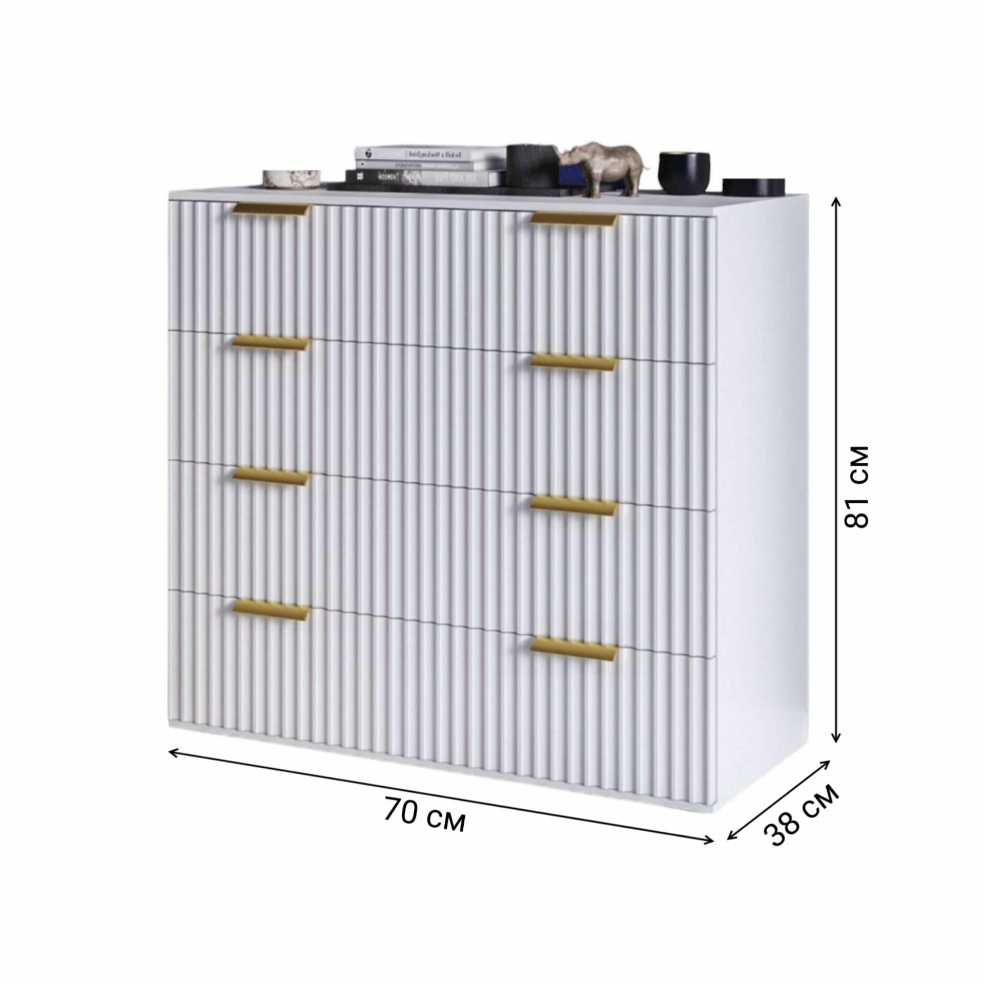 Комод, тумба прикроватная белая, 4 ящика с золотыми ручками, 70x38x80 см