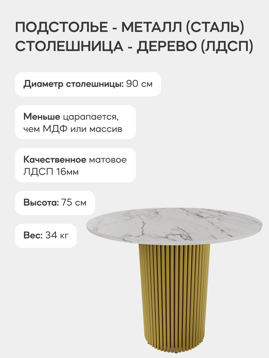 СохранитьGEN GROUP Кухонный обеденный стол TRUBIS Wood L D90 см белый мрамор с золотым подстольем интересное: