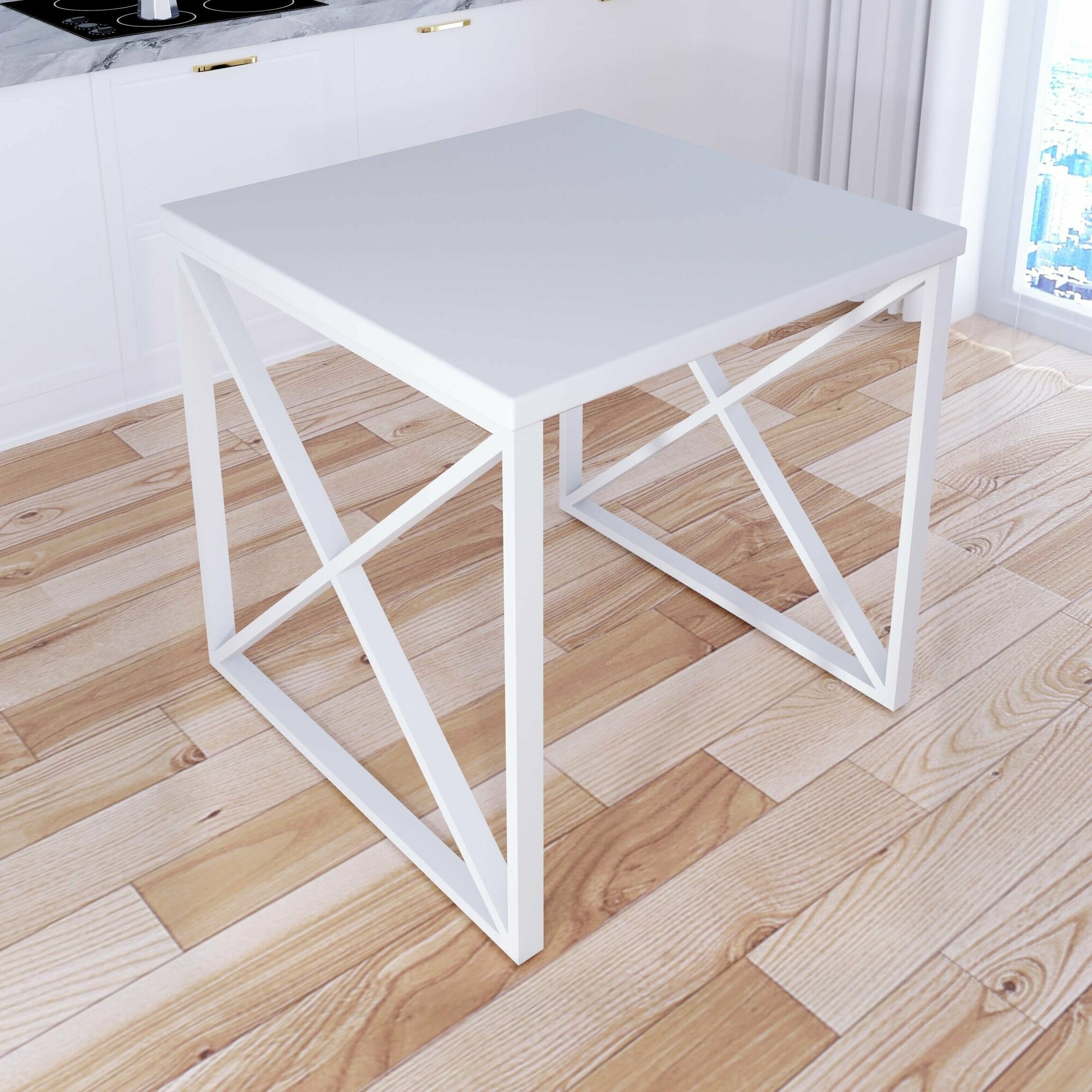 Стол кухонный Loft с квадратной белой столешницей из массива сосны 40 мм и белыми металлическими крестообразными ножками, 70x70х75 см