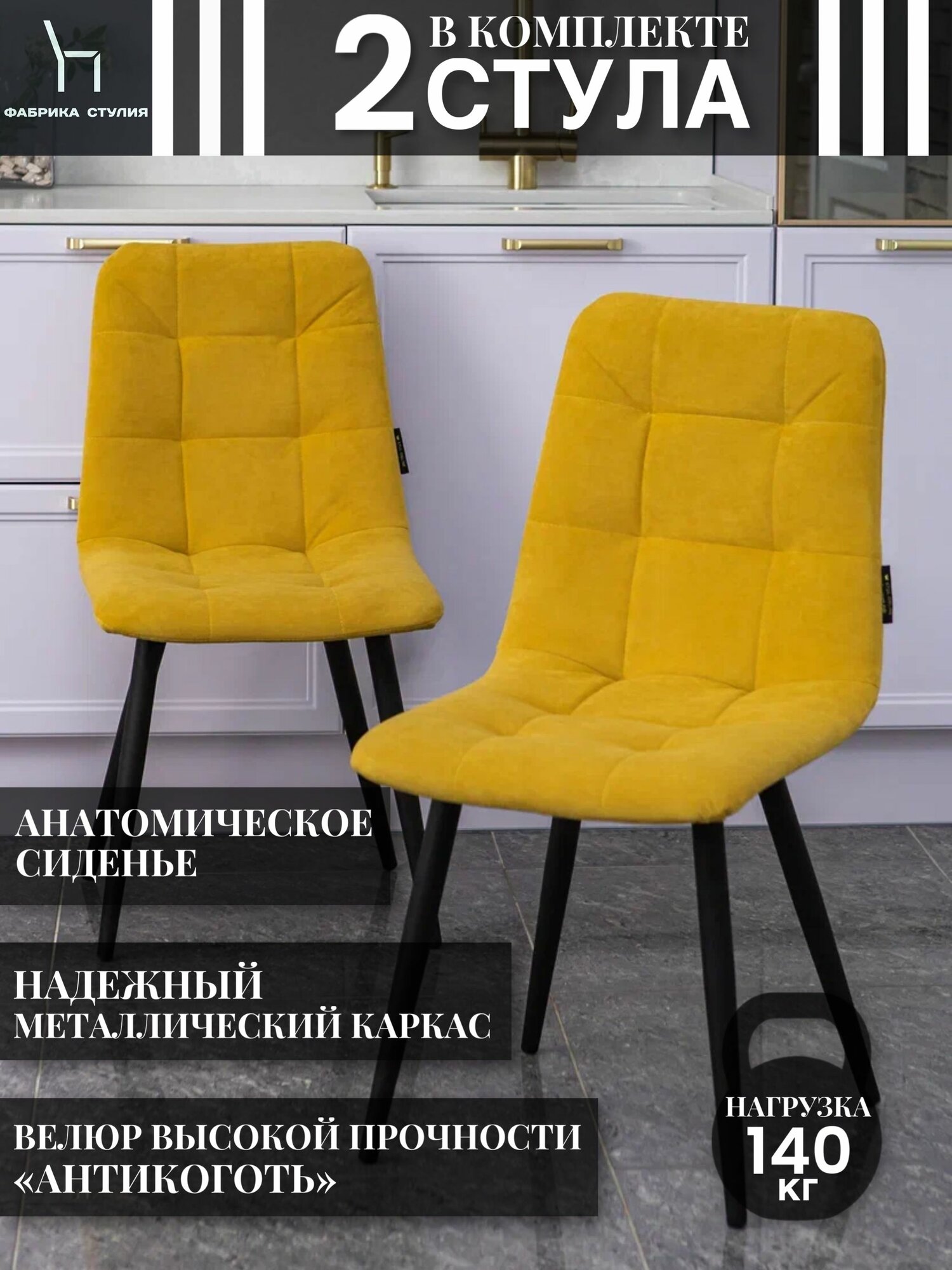 Стул Тедди для кухни из велюра/ Стул кухонный цвет горчица, ножки белые /4 шт