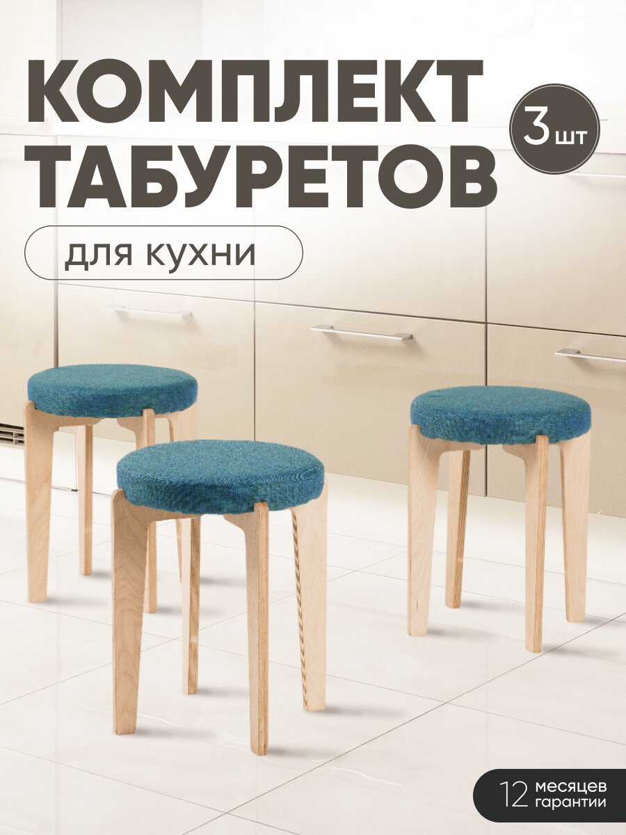 Табурет для кухни мягкий 3шт, Axiomawood, дуб + синий, нагрузка до 120кг