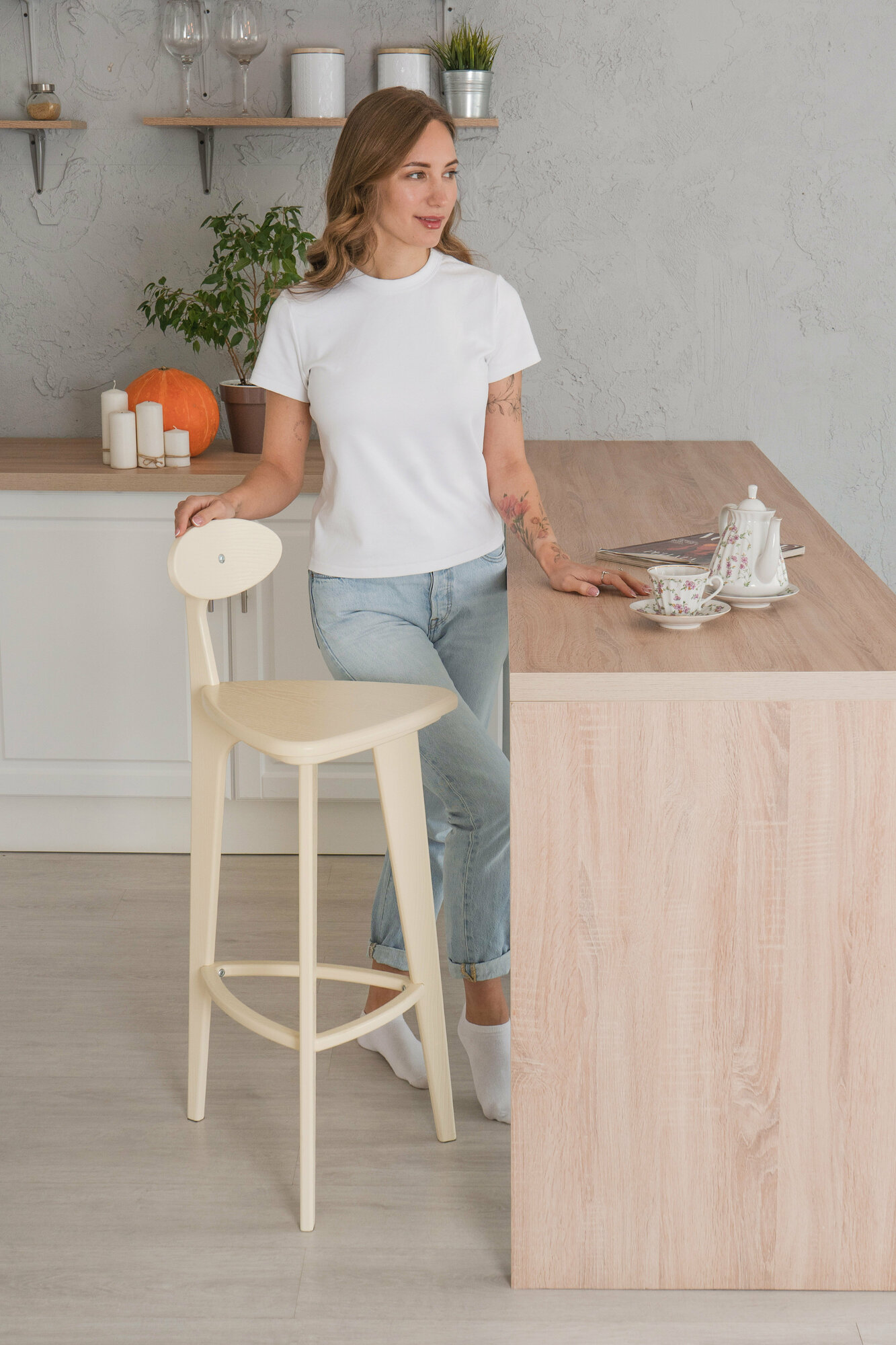Барный стул Glider деревянный со спинкой 3 прямые ножки кухонный, цвет бежевый интересное: