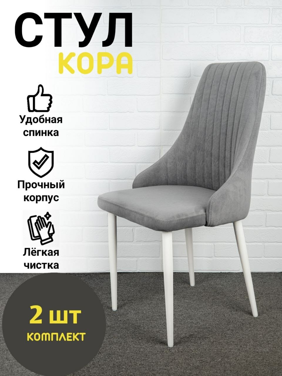 Купить Стулья "Кора" Azzurro mebel, 2 шт, антивандальный велюр, серый, белые ножки