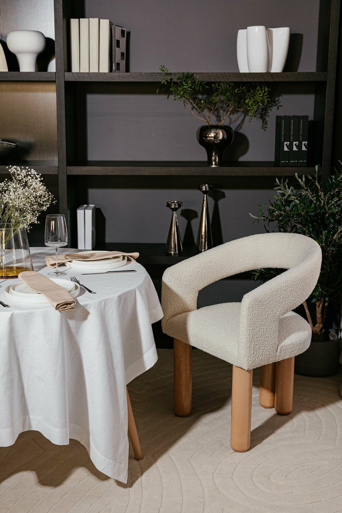Стул кресло PECOLA мягкое со спинкой с подлокотниками на деревянных ножках для отдыха стильный современный в гостиную в кухню в детскую натуральное дерево букле молочный, ножки тон черный