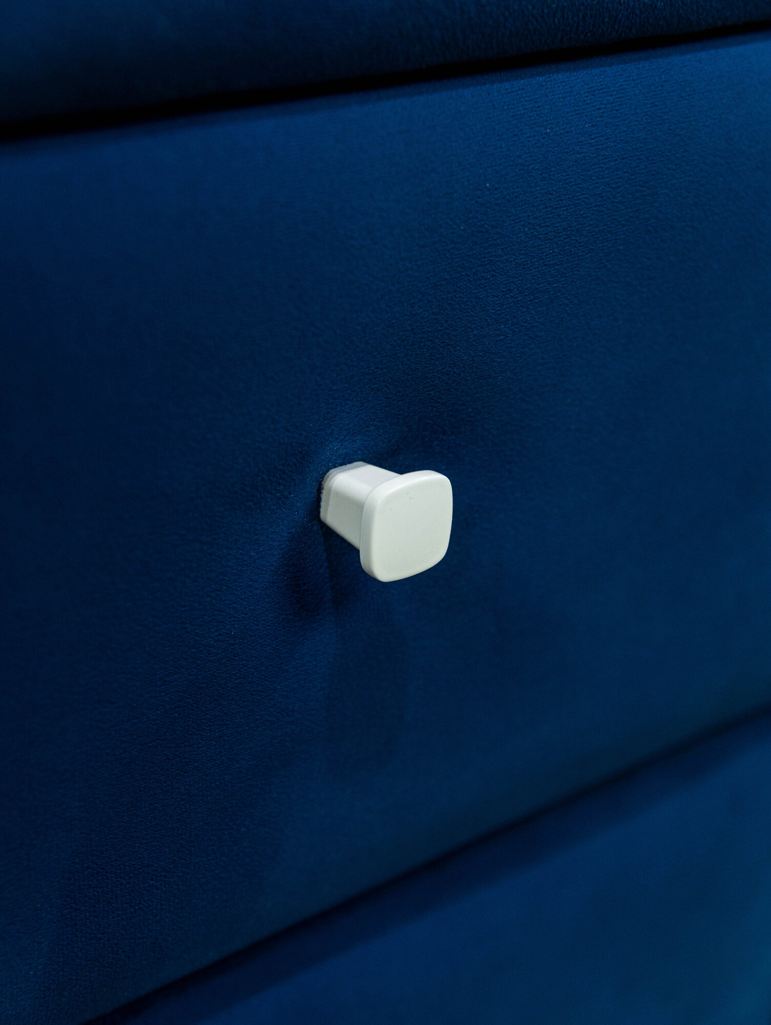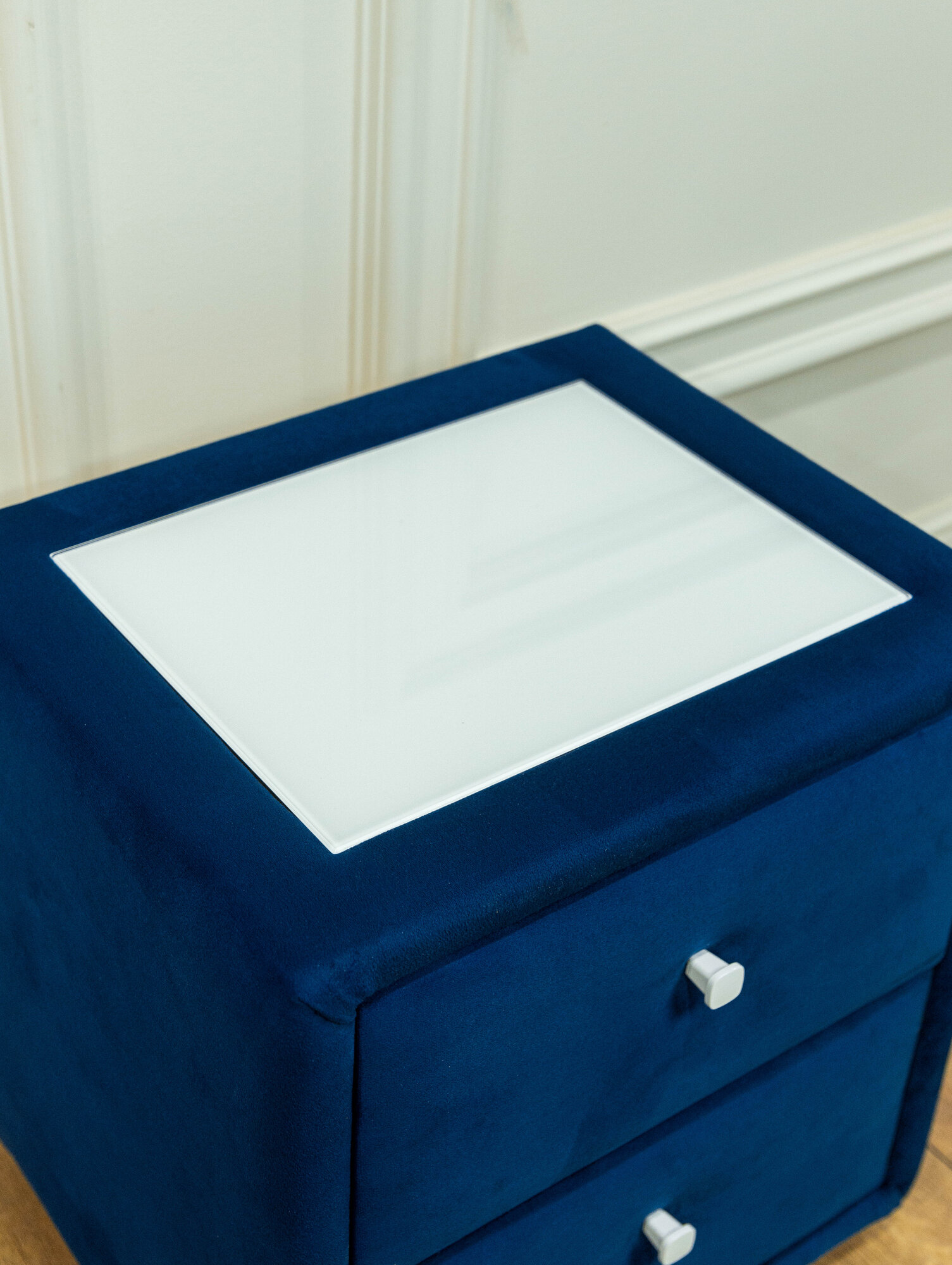 Прикроватная тумба ДЭРИЯ, с ящиками, с мягким текстильным покрытием, ЛДСП, синяя стеклянная поверхность