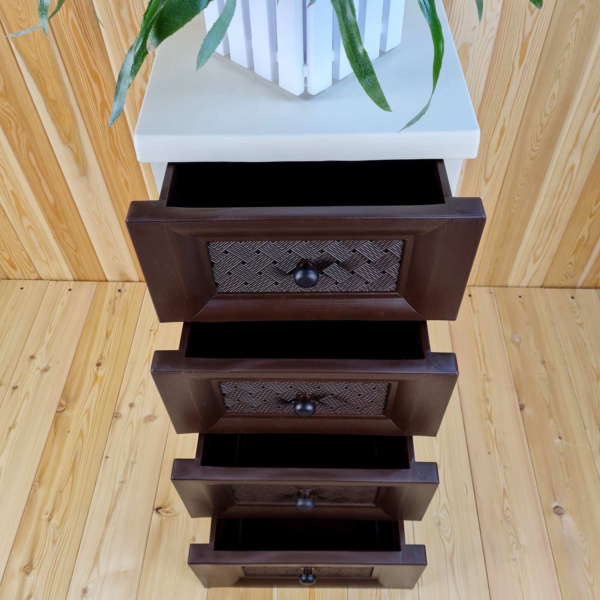 Комод пластиковый ,"УЮТ", усиленный, 4 этажа, Цвет: Бежевый с коричнево-шоколадными плетёными ящиками.
