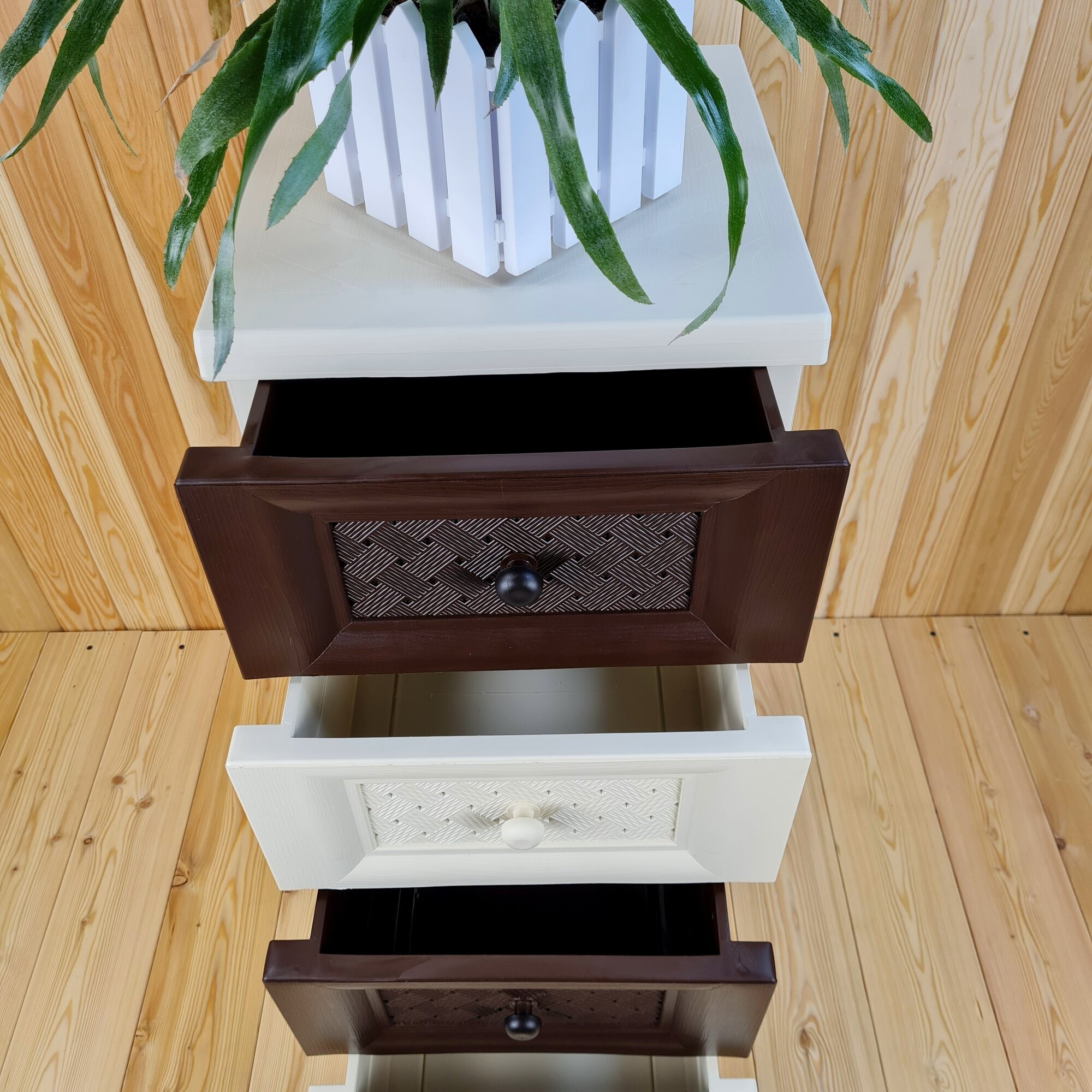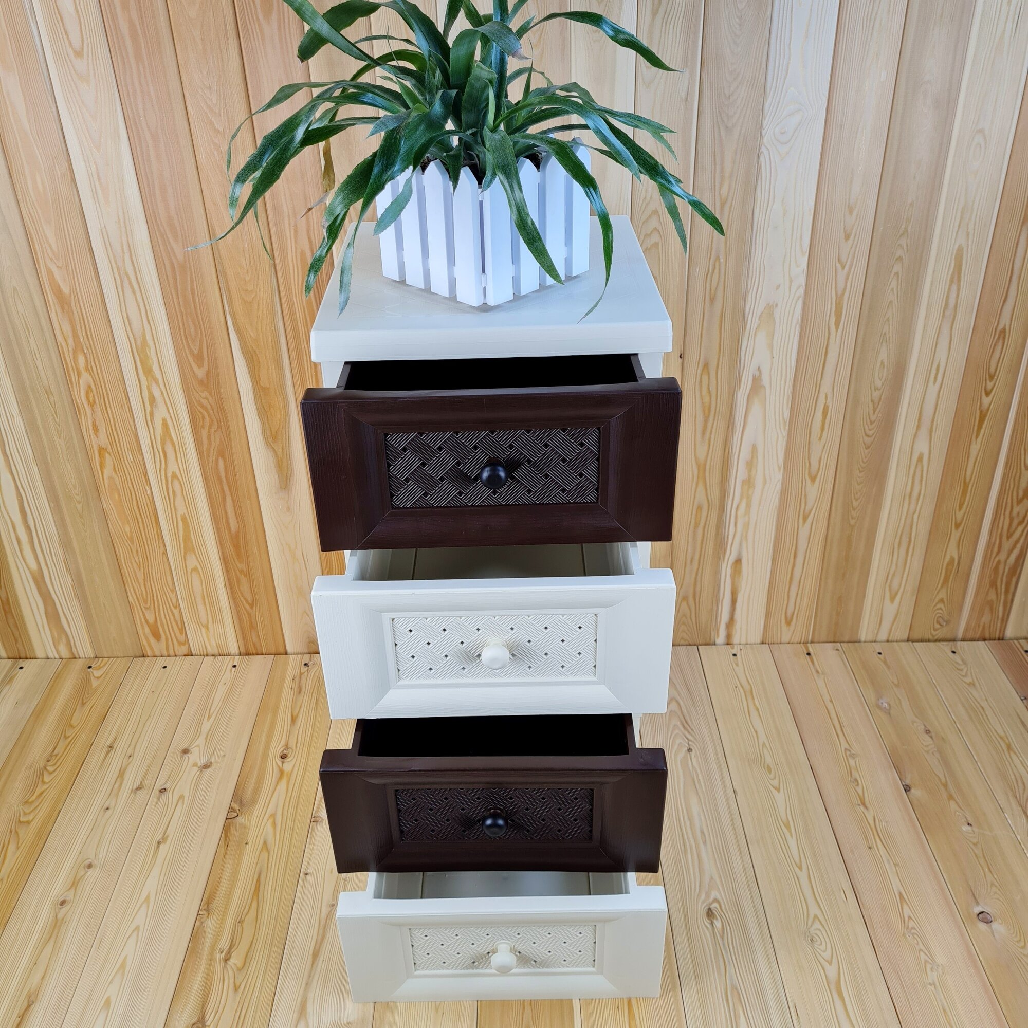 Комод пластиковый ,"УЮТ", усиленный, 4 этажа, Цвет: Бежевый с коричнево-шоколадными плетёными ящиками.