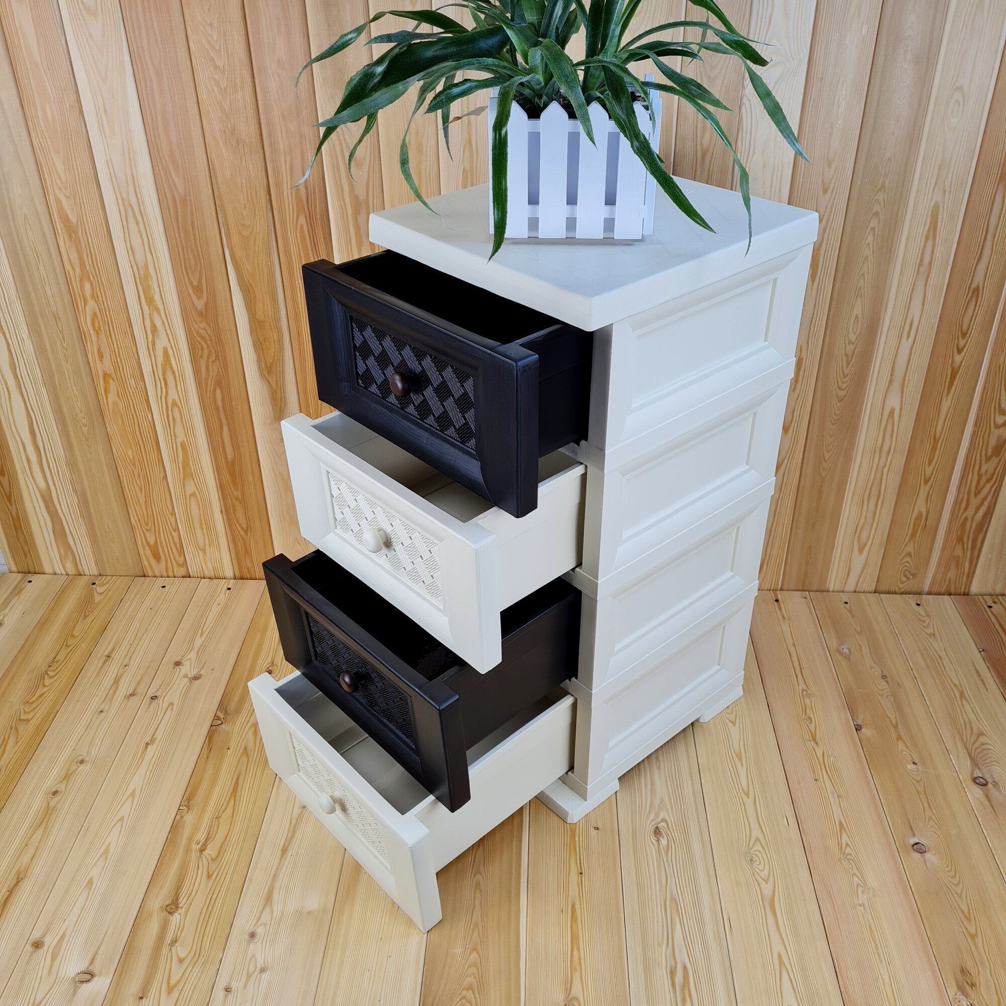 Комод пластиковый ,"УЮТ", усиленный, 4 этажа, Цвет: Бежевый с бежево-коричневыми плетёными ящиками.