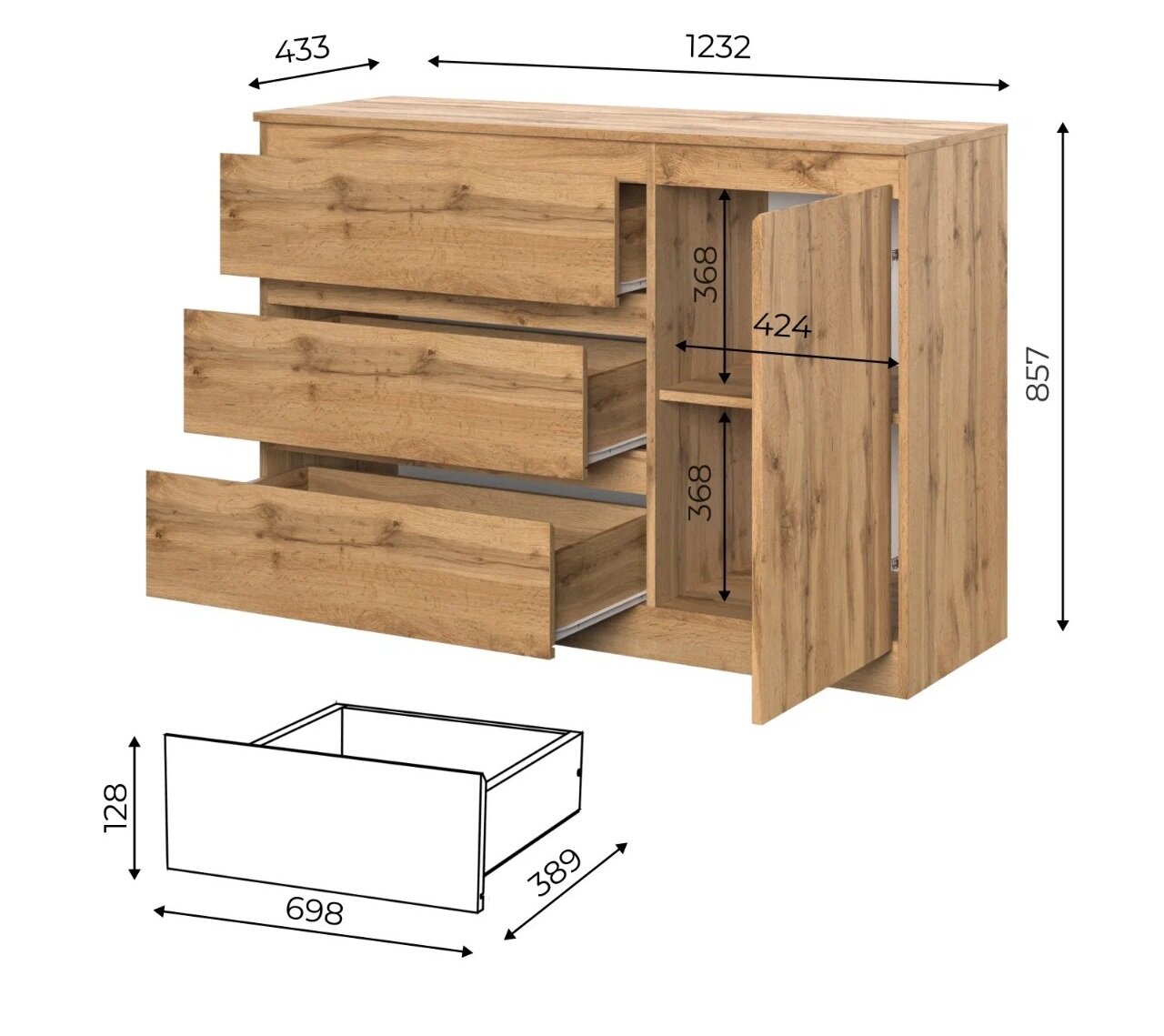 Комод c 3 ящиками и распашной дверцей STARK T-7 Дуб Вотан 123,2 х 85,7 х 43,3 см (ШхВхГ) интересное: