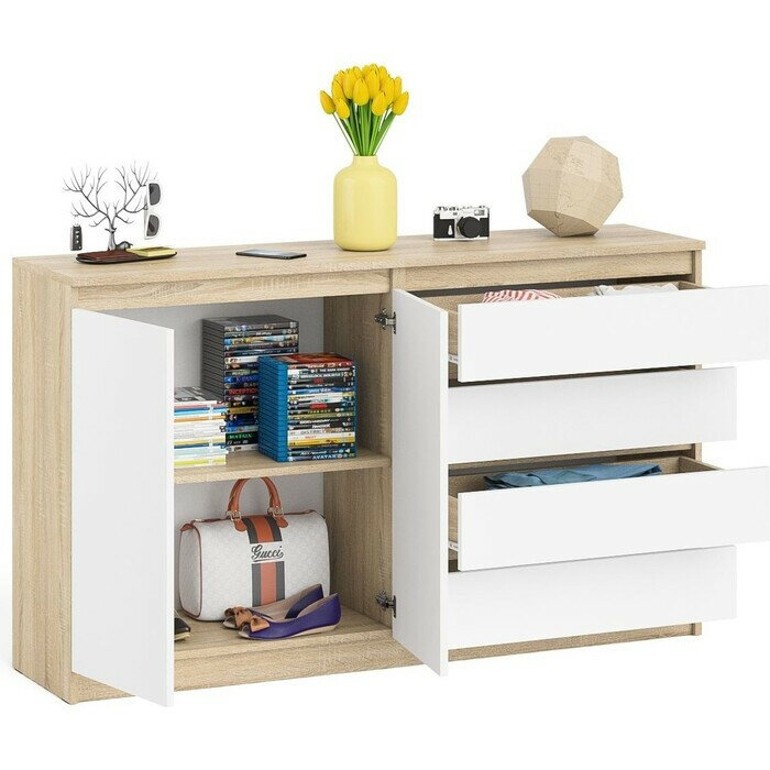 Комод широкий на четыре ящика и две дверки Мори МК1600.1 цвет дуб сонома/белый, ШхГхВ 160,4х41х94 см, НЕ универсальная сборка