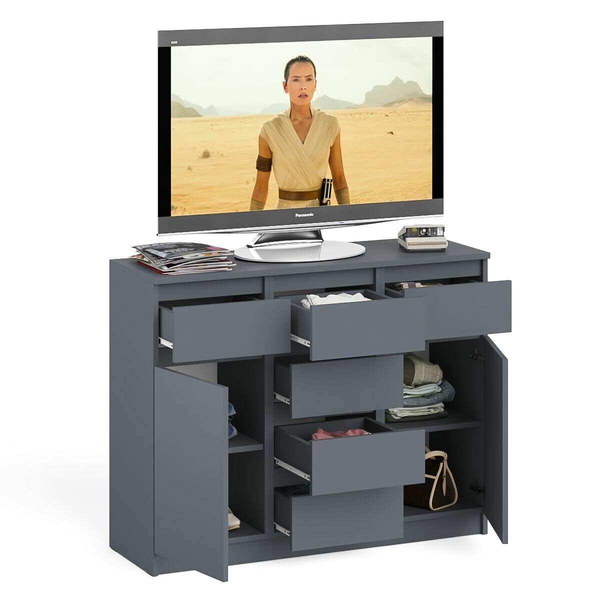 Комод широкий на четыре ящика и две дверки Мори МК1600.1 цвет графит, ШхГхВ 160,4х41х94 см, НЕ универсальная сборка
