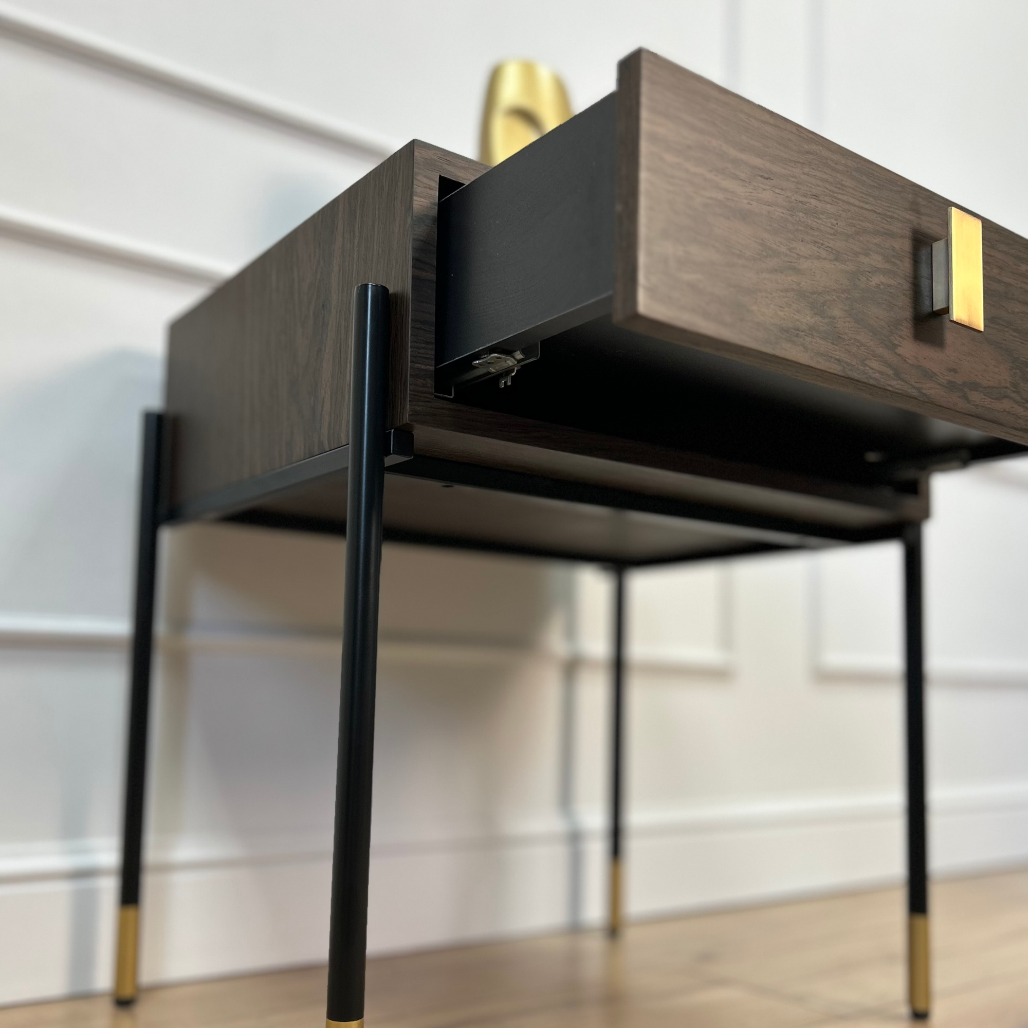 Тумба прикроватная шпон ореха, тумбочка с ящиком напольная на золотых ножках, дизайнерская мебель для спальни Walnut Gold 54х40х56 см