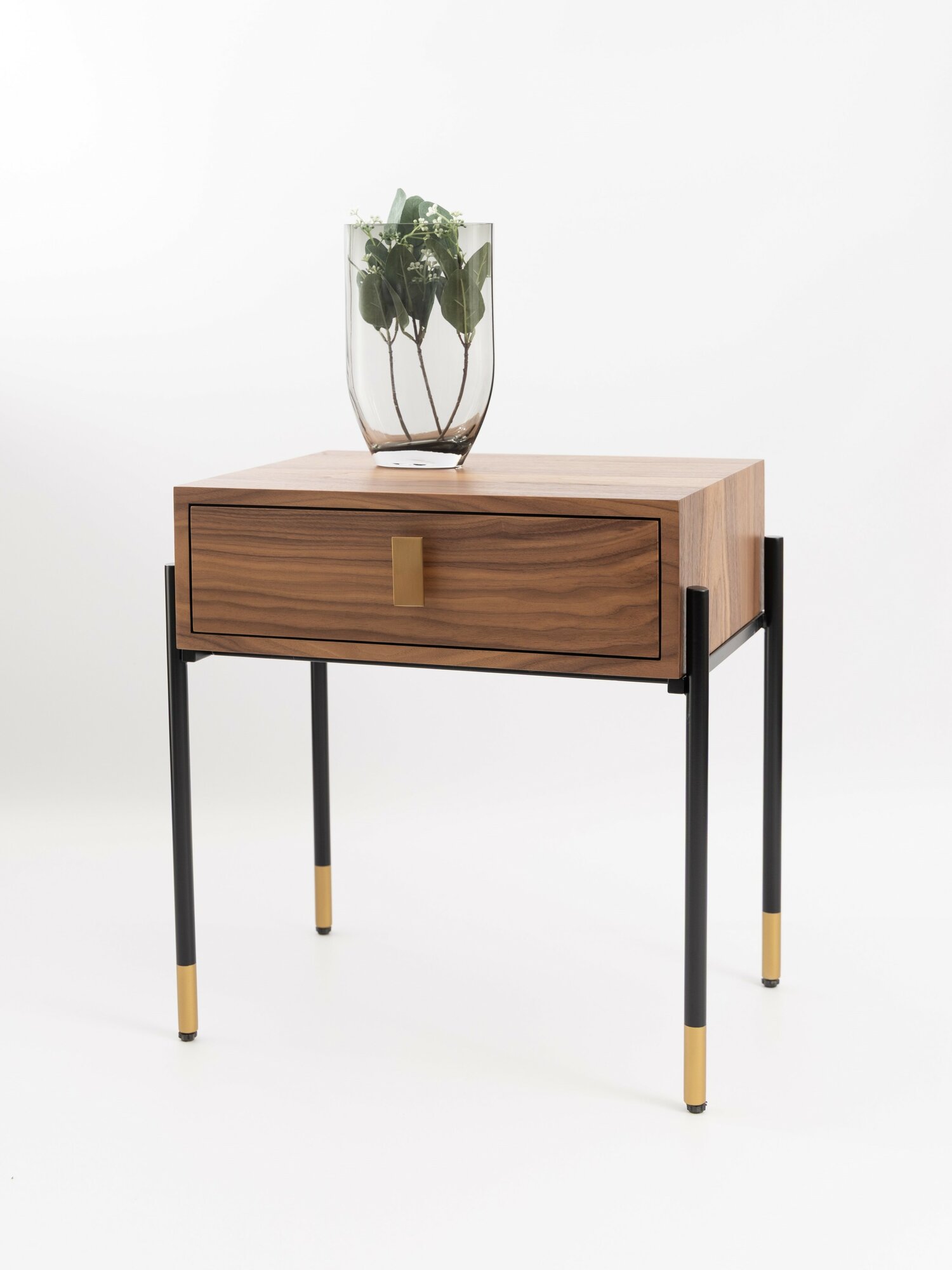 Тумба прикроватная шпон ореха, тумбочка с ящиком напольная на золотых ножках, дизайнерская мебель для спальни Walnut Gold 54х40х56 см