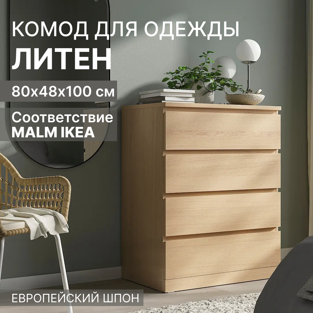 Комод с ящиками для одежды, беленый дуб, литен (MALM IKEA), 4 ящика, 80х48х100 см интересное: